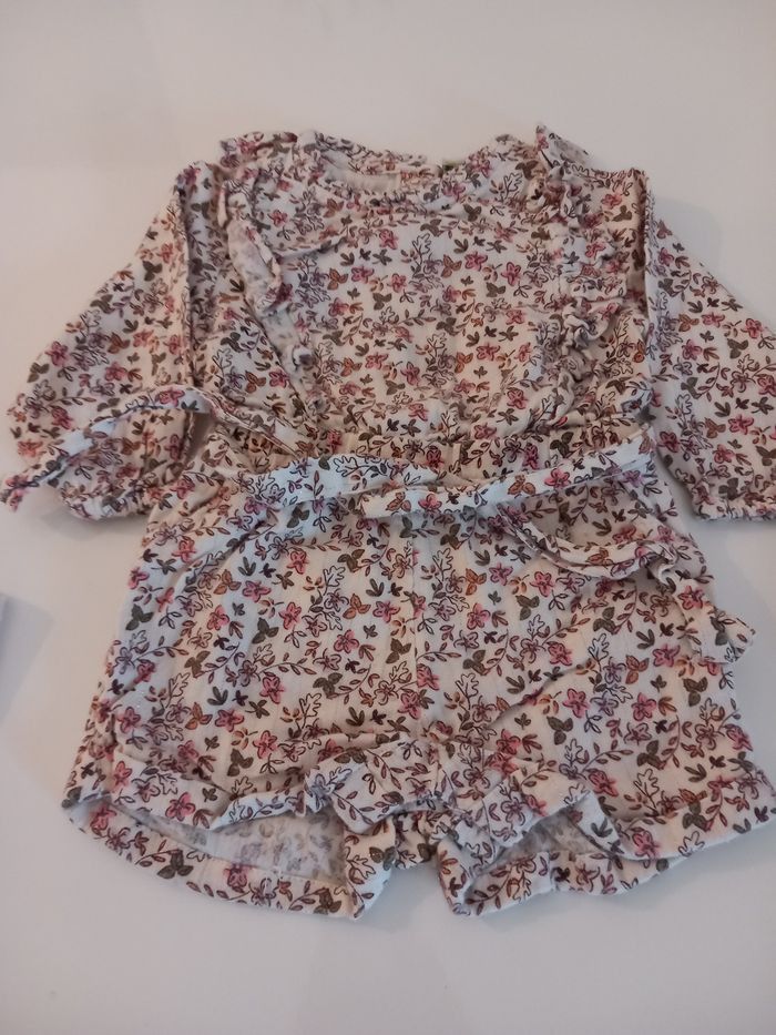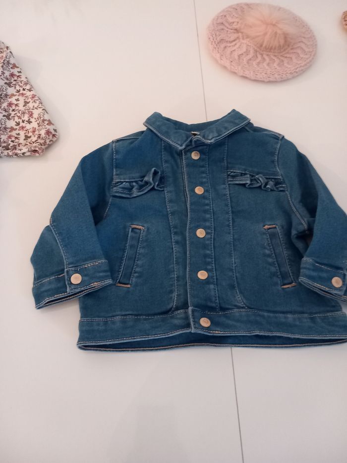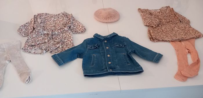 Parfait état. Très peu portés. Pas de défauts. Le lot comprend : - 1 combishort en coton chaud + collant - 1 robe fleuris doublée + collant - 1 veste en jean - 1 béret rose