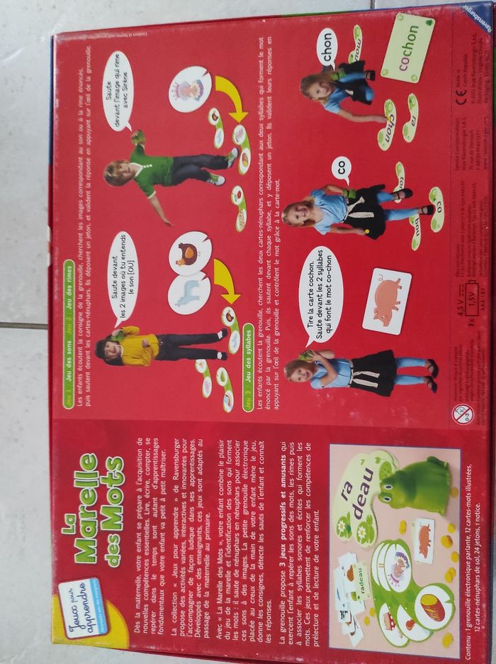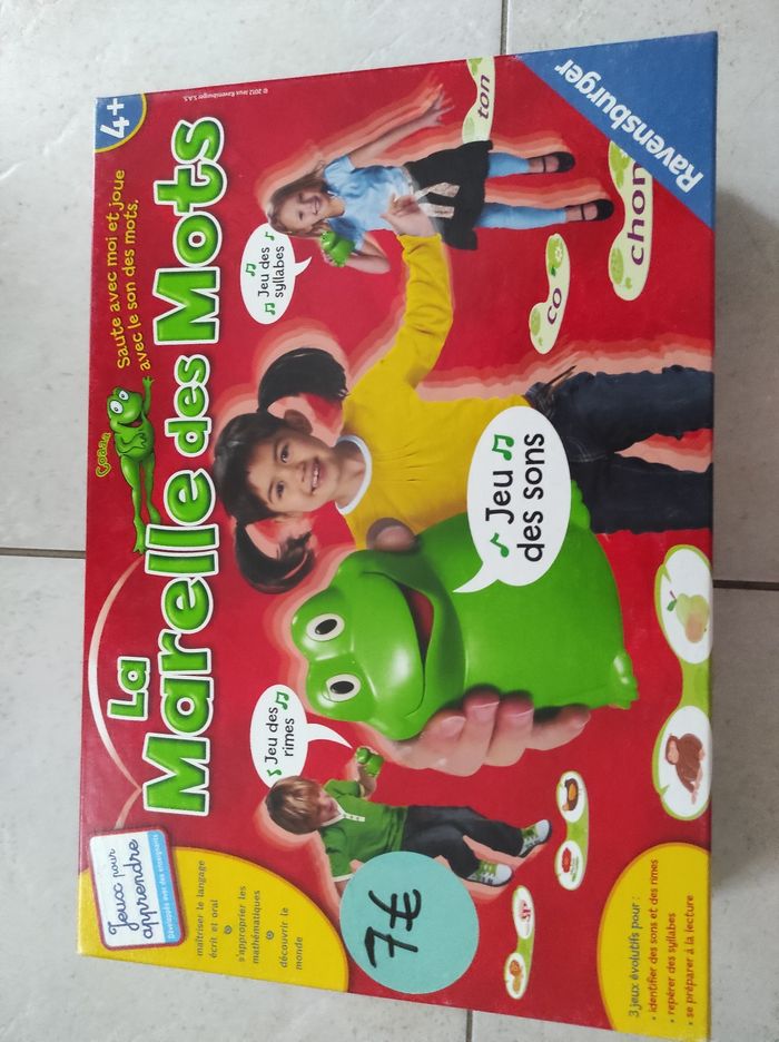 Jeu UNIQUE et INNOVANT alliant plaisir et notions de prélecture.Basé sur la phonologie, ce jeu prépare l’enfant à la lecture. Une initiation ludique grâce à un module interactif qui parle, coasse et qui accompagne l’enfant. 3 modes de jeu rythmés et évolués :-Mode 1 : L’enfant se familiarise avec les SONS des mots-Mode 2 : L’enfant identifie les RIMES dans les mots-Mode 3 : L’enfant repère des SYLLABES énoncéesL’enfant écoute, repère, saute et donc apprend !