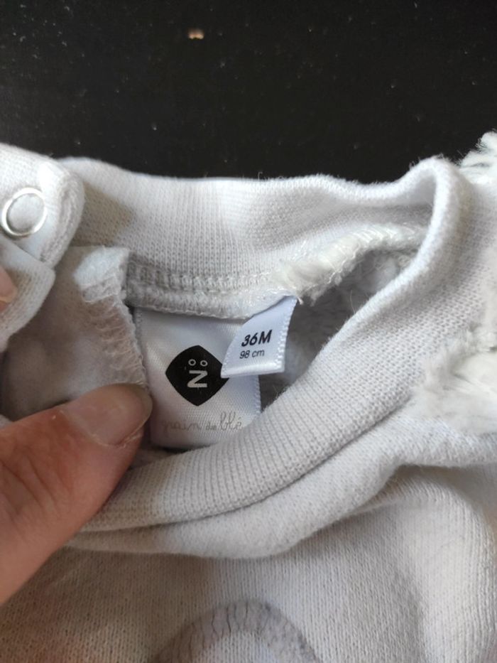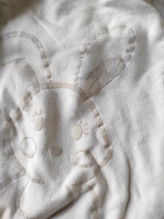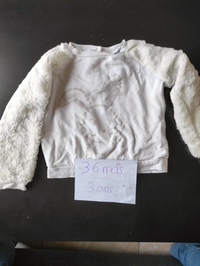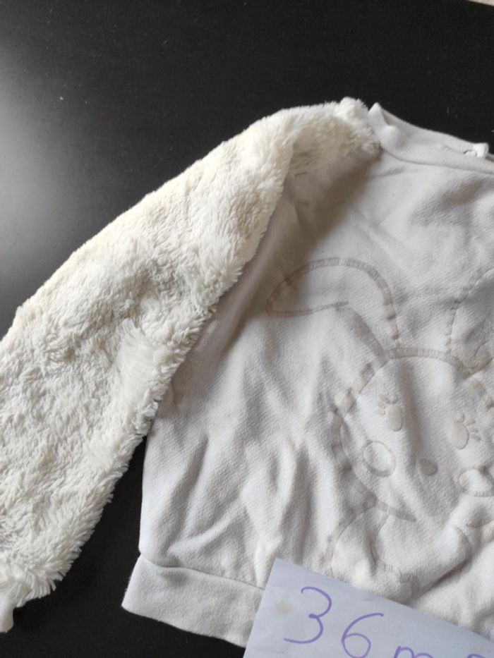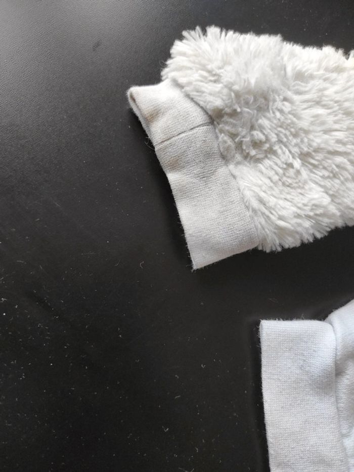 Sweat blanc avec manche en moumoute 3 ans Les oreilles du lapin un peu craquelé ( voir photo ) Et bout de la manche a peine décoloré. Comme dernière photo ( très léger) Bon état général