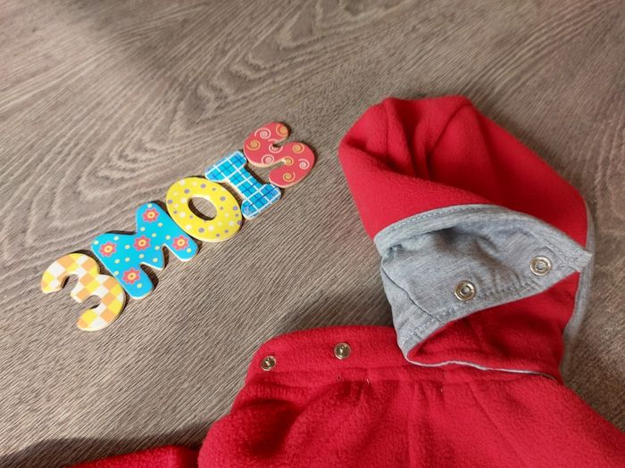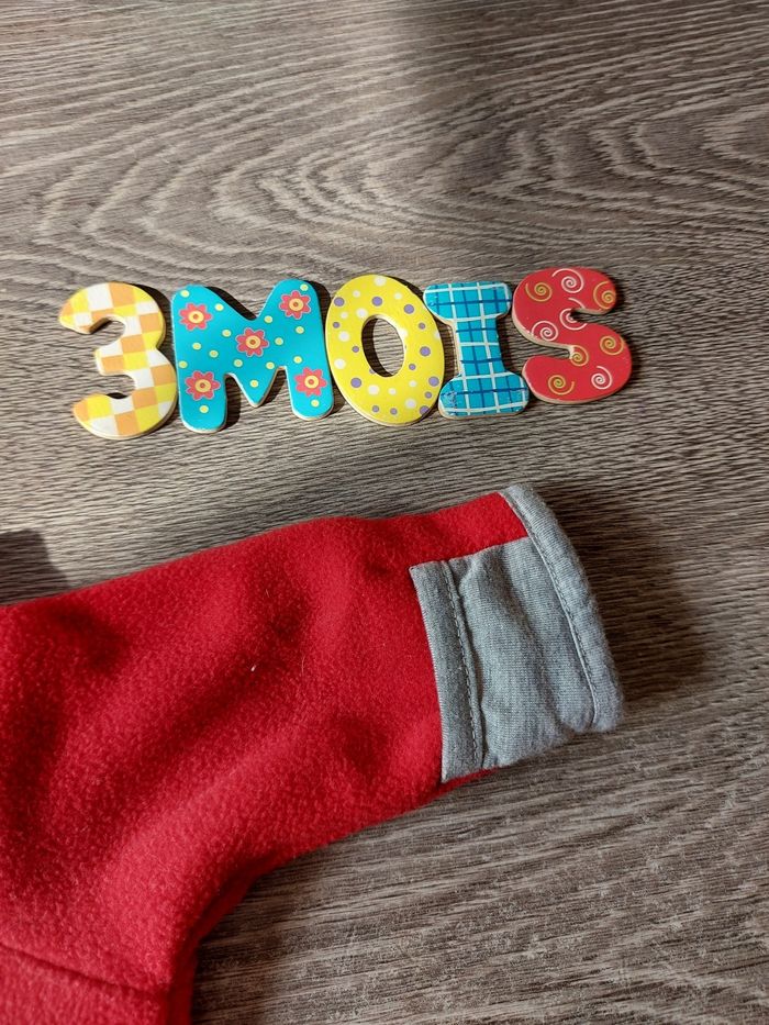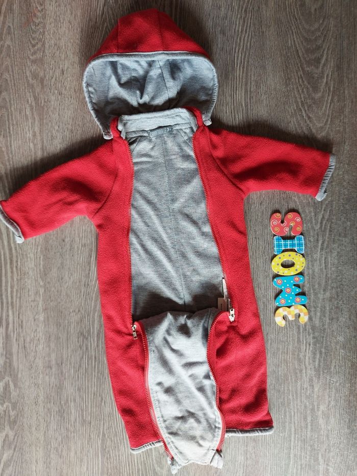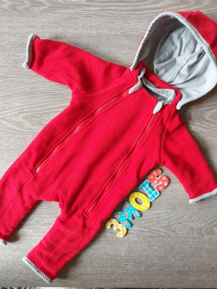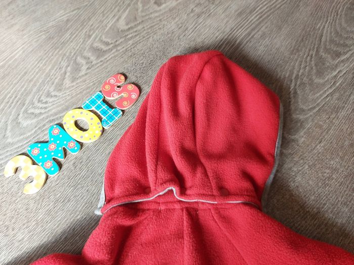 Combi chaude rouge. Fine. Ouverture sur l'avant avec 2 fermetures éclairs. Capuche amovible. Sans pieds. Marque Caramouille.