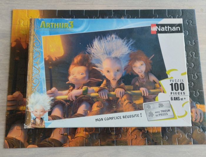 Puzzle de 100 pièces Arthur et les Minimoys 3 Complet Boite abîmée. Attention le trieur de pièces noté sur la boîte n y est pas Âge : 6ans