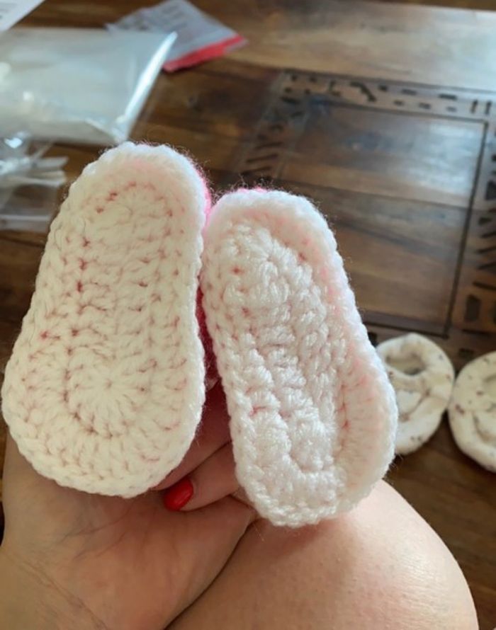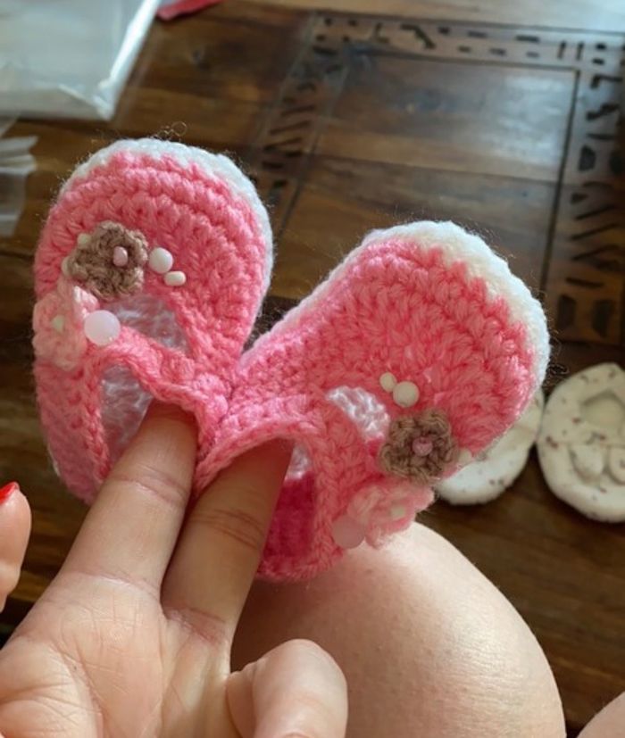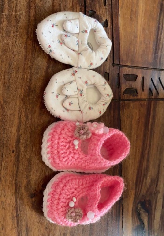 lot 2 chaussons bébés naissance rose tricoter mains les blancs sont des petit bateaux idéal pour sorti de bains jamais utilisé ni l’un ni l’autre
