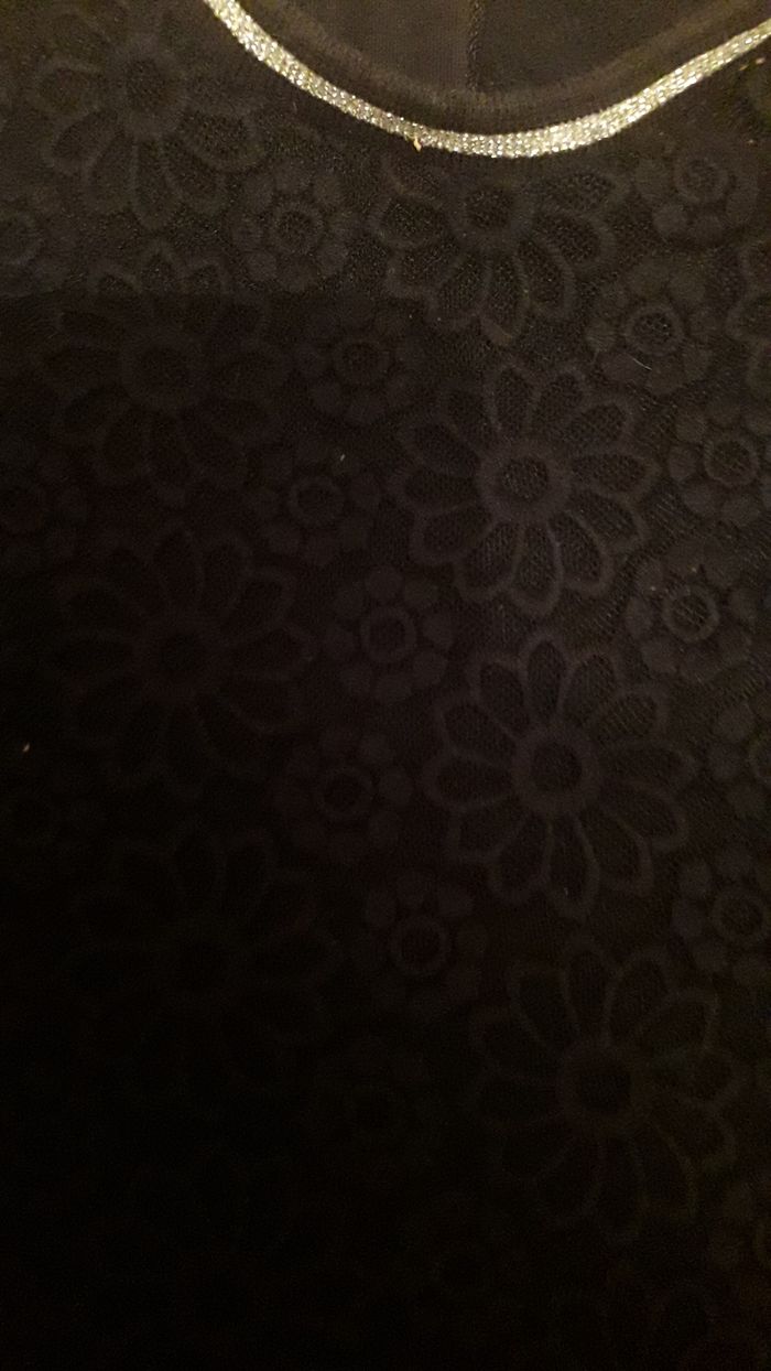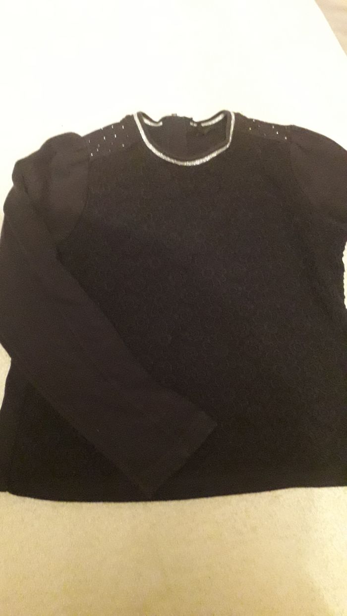 Sweat fille noir manches longues motifs devant et encolure argentée et petits clous sur les épaules.