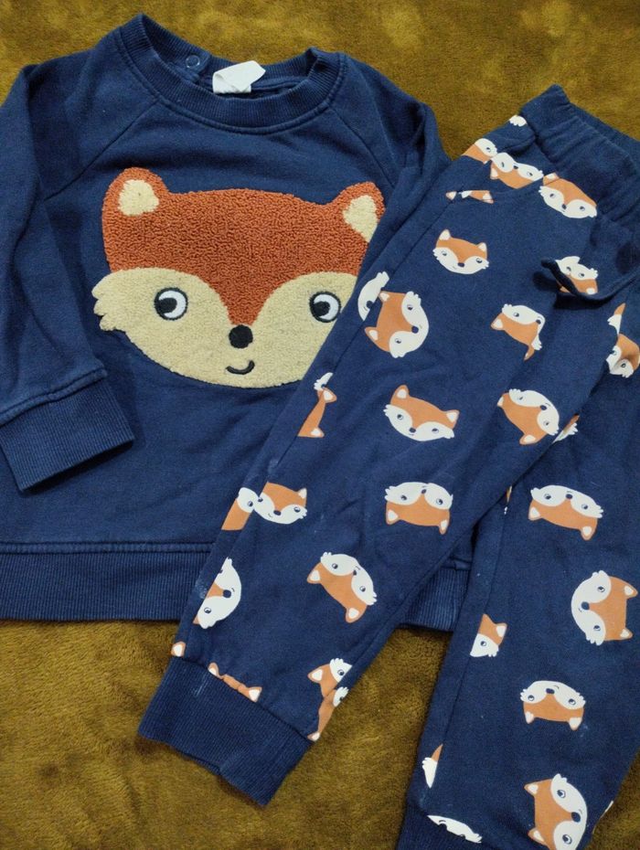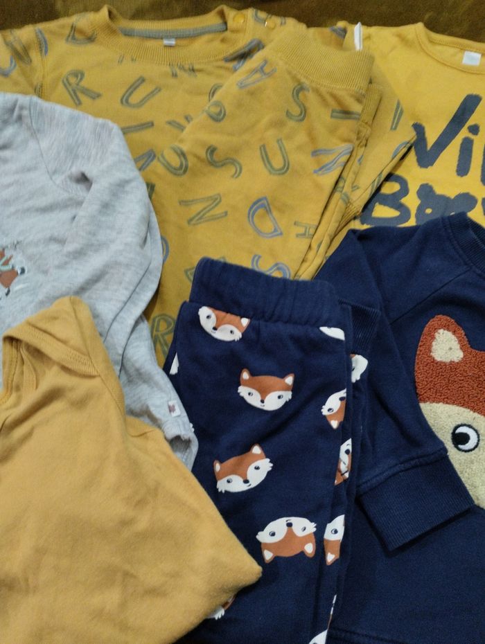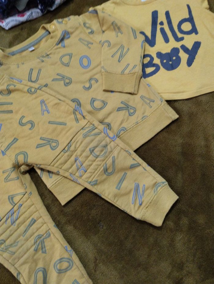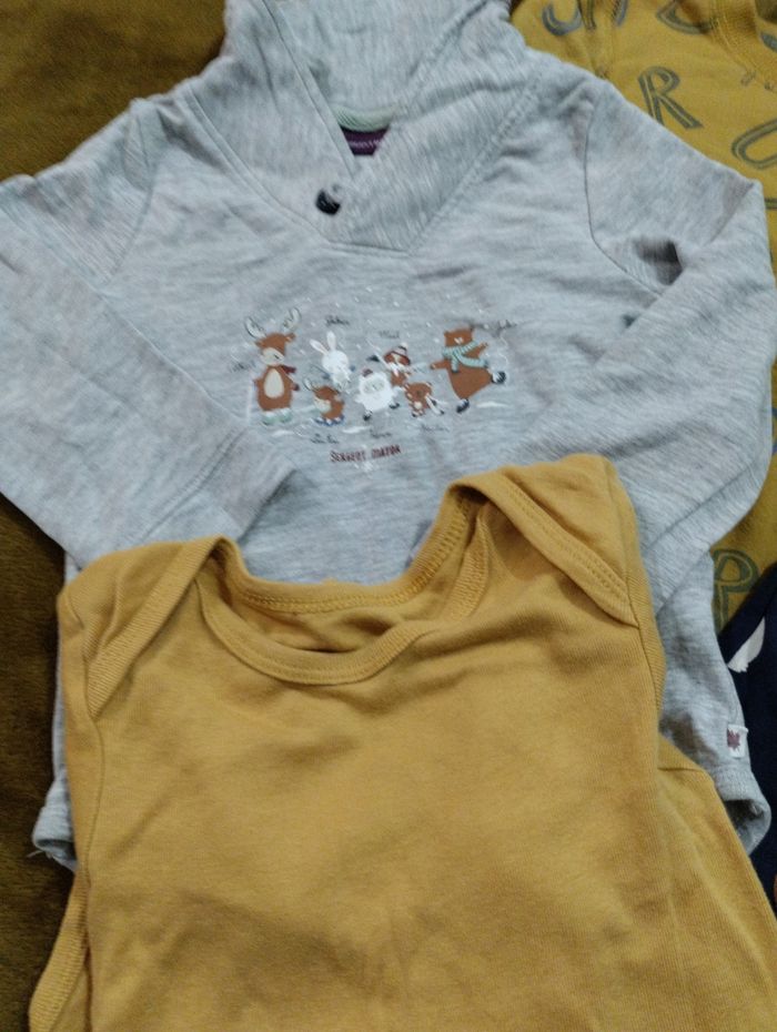 Lot garçon comprenant 1 tee-shirt longues manches 9 mois tex 1 jogging Zeeman jaune 1 jogging marine h&M taille 18 mois et 2 bodies 24 mois bon état