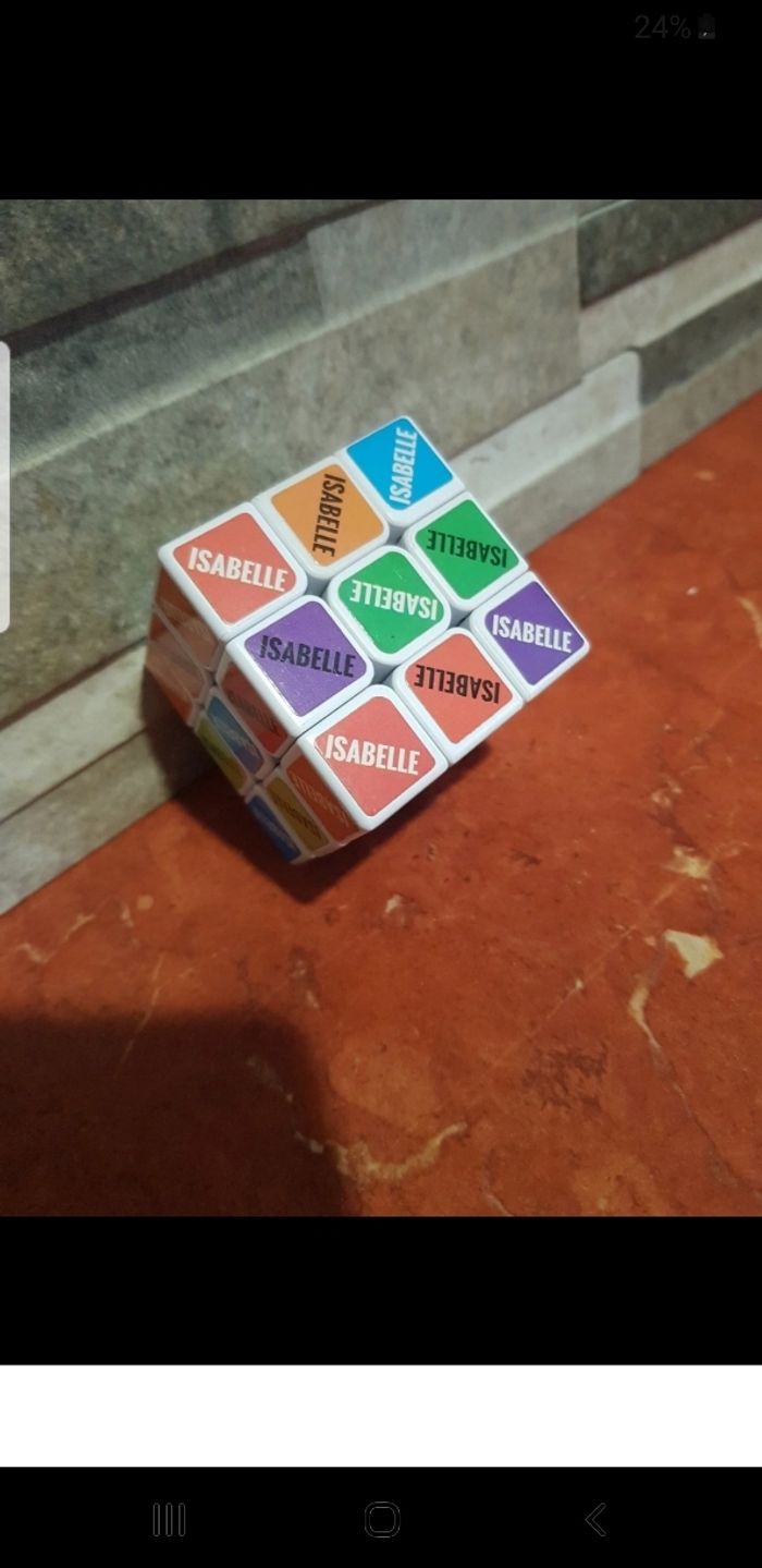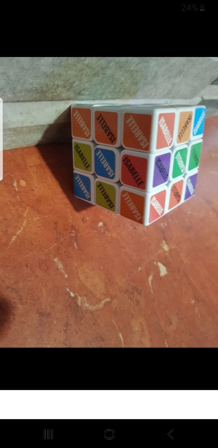 Rubicube pour passer de longs moments de réflexion. Avec le prenom d Isabelle noté sur chaque case.
