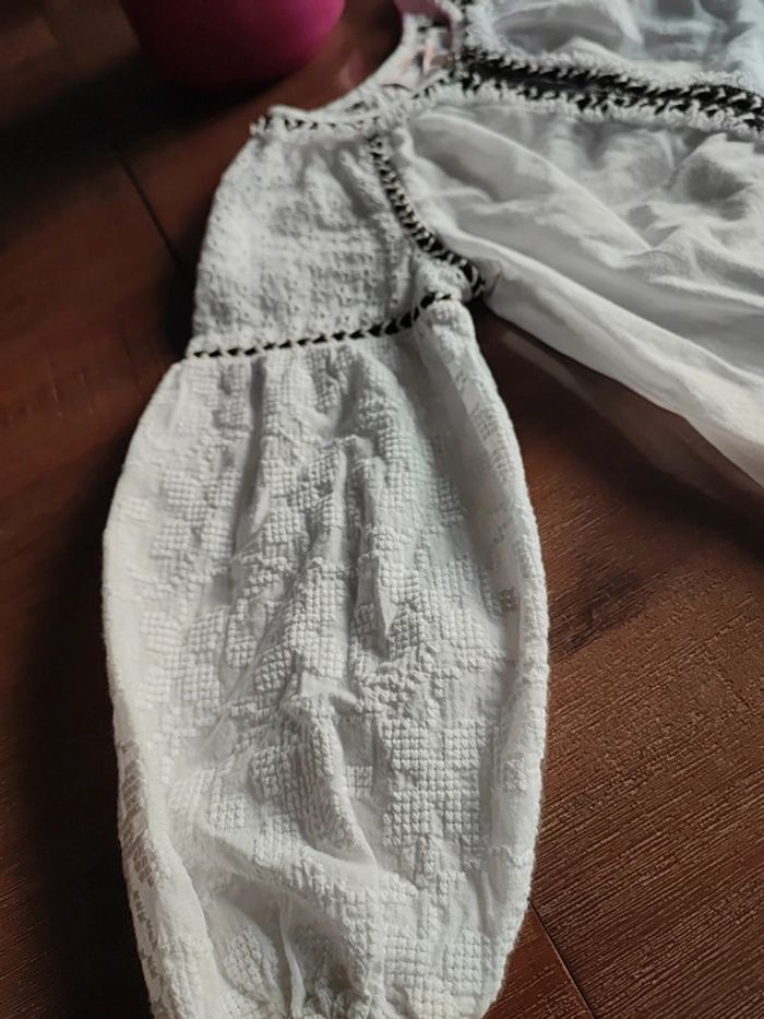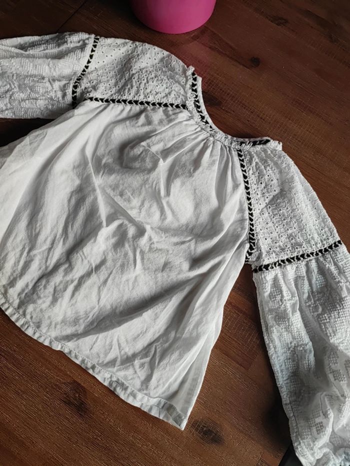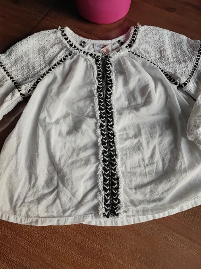Blouse légère Blanche et noire Manches évasées, poignets élastiques, épaules ajourées Petit bouton au cou Forme trapèze Atypique et jolie Marque TAO Taille 2 ans, 86cms Très bon état #cyboulette44fille24mois