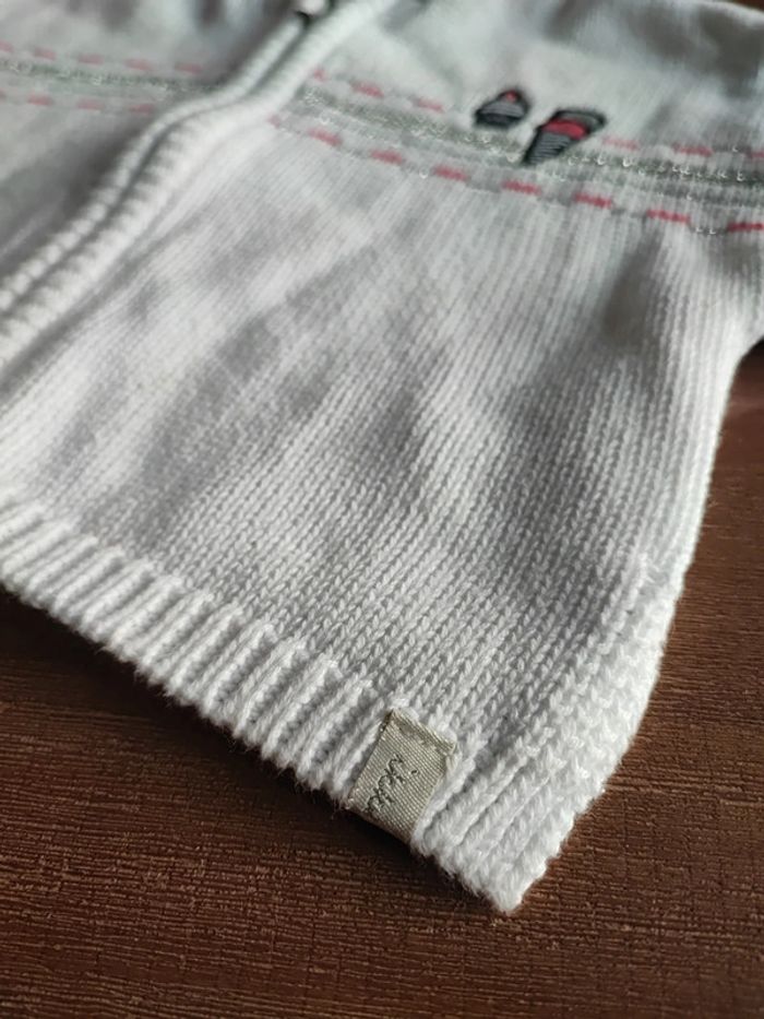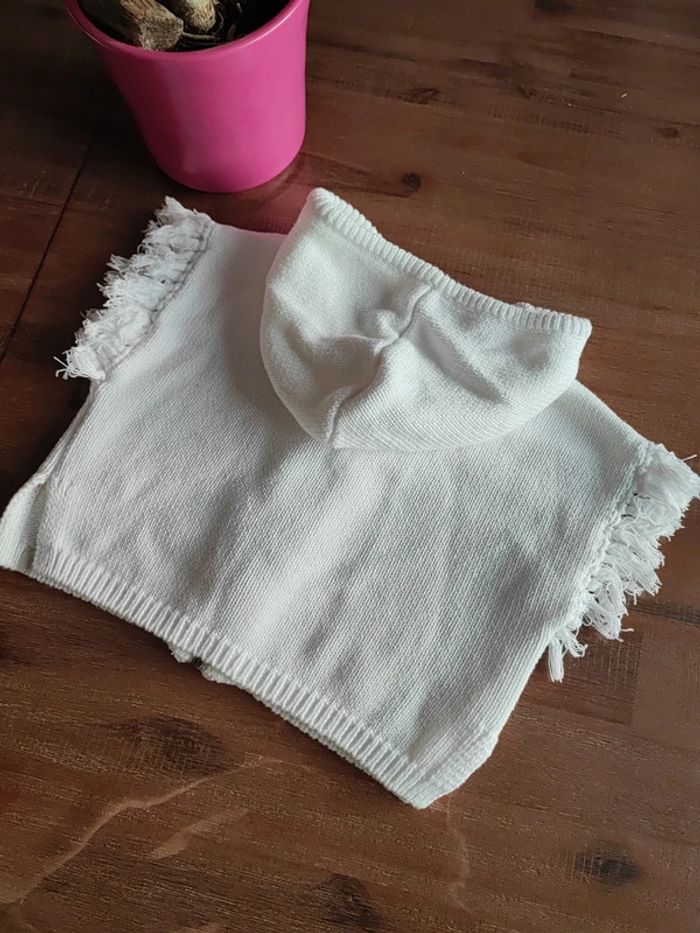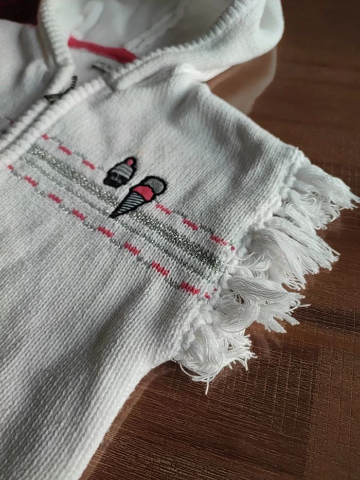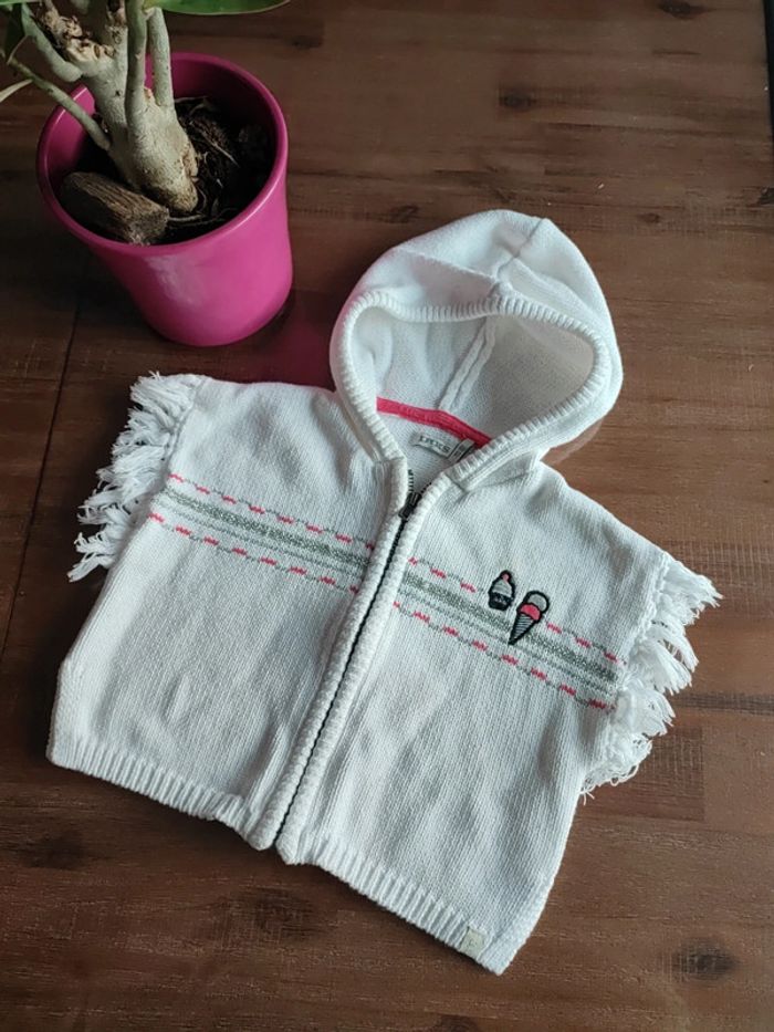 Gilet sans manches a capuche Froufrous Petits liserets roses et argent sur poitrine Fermeture éclair Marque IKKS Taille 6 mois, 67cms Il est large, ma fille (pourtant grande) l'a porté jusqu'à ses 18/20mois, donc il est top #cyboulette44fille6mois