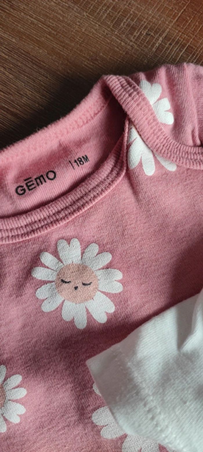 Lot de 2 bodies Manches courtes Un blanc crème avec motif arrosoir "je cultive le bonheur Un rose avec motifs fleurs blanches Très bon état Marque Gémo Taille 18 mois #cyboulette44fille18mois
