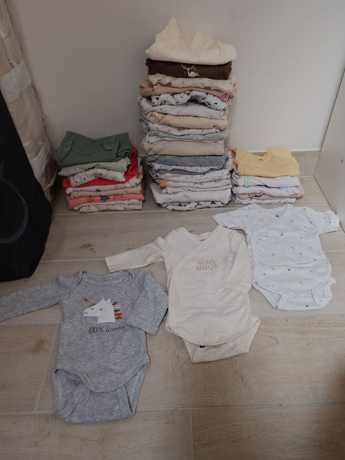 Vend 36 bodies. Chaque bodie a été porté qu'une seule fois (pas de tâches ni de trous) 10 bodies qui se met par la tête 20 bodies qui s'attachent par l'avant 6 bodiess qui s'attachent par l'avant en manche courte Marque : Kiabi, tape à l'oeil, Gémo