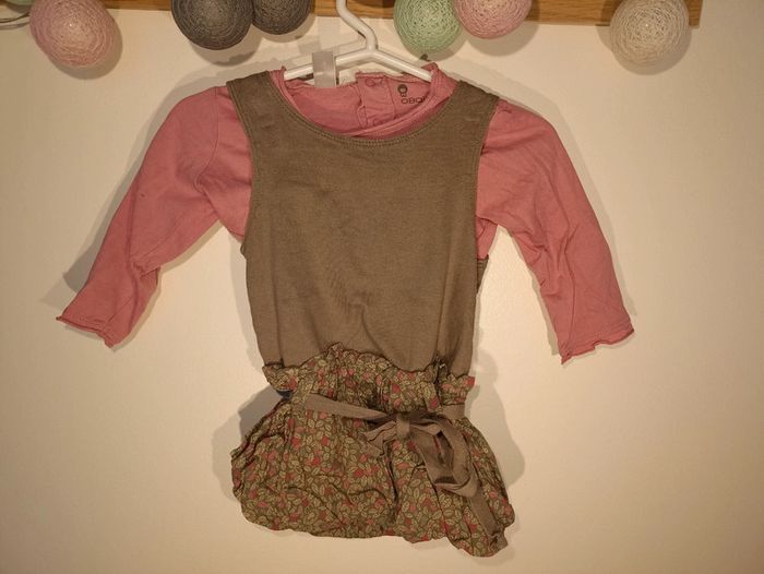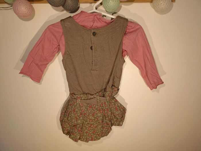Ensemble composé de 1 robe kaki ceinturée, bas imprimé feuilles rouges, roses, marrons 1 haut à manches longues en coton bio, couleur vieux rose N'hésitez pas à parcourir mon dressing pour d'autres pièces pour bébé et pensez aux lots