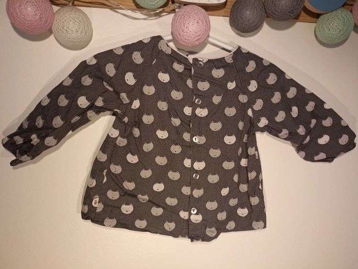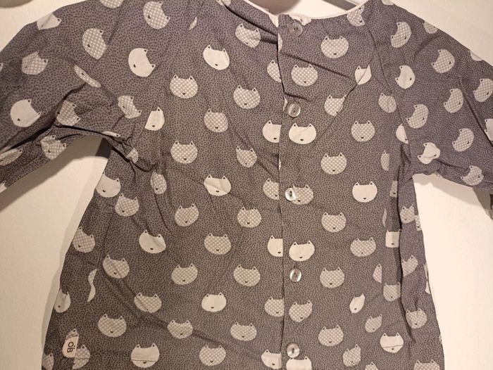 Blouse grise effet pointillés avec petites têtes de chats blanches et grises Fermeture par boutons à l'arrière N'hésitez pas à parcourir mon dressing pour d'autres pièces pour bébé et pensez aux lots