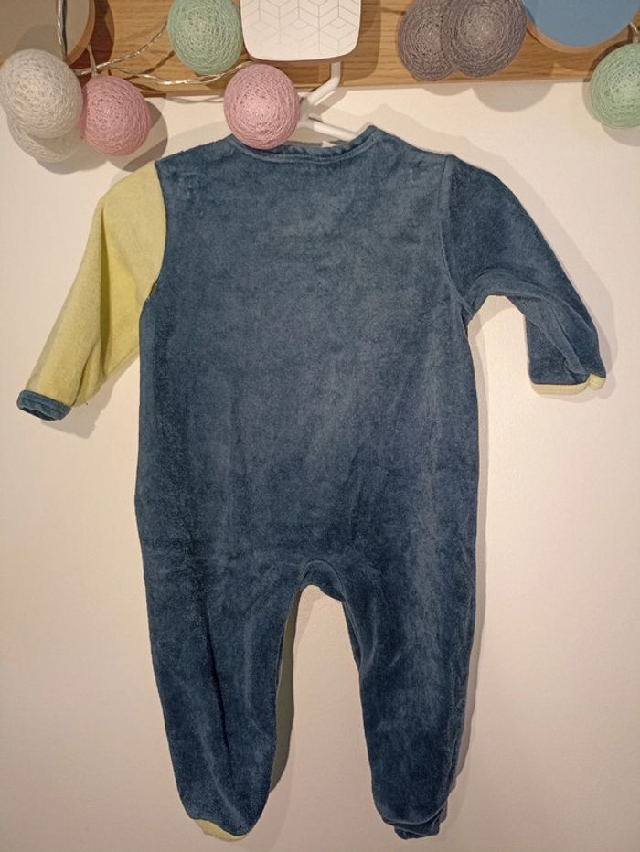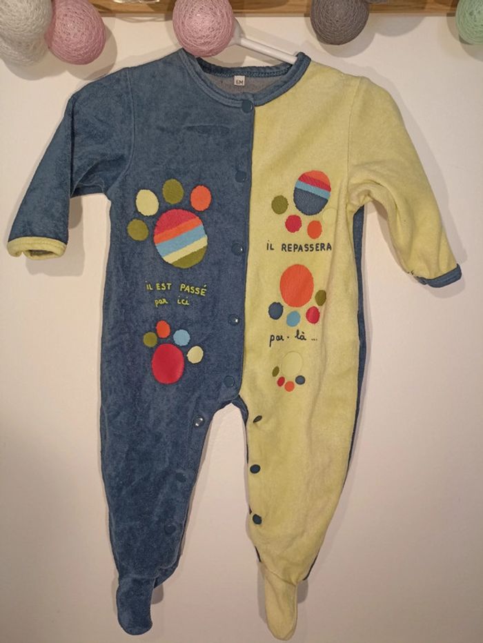 Pyjama en velours bicolore bleu pétrole et vert anis avec impression pattes et comptine. Ouverture par pressions plastique à l'avant N'hésitez pas à parcourir mon dressing pour d'autres pièces pour bébé et pensez aux lots