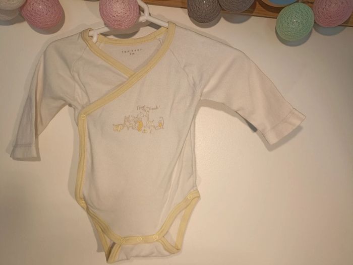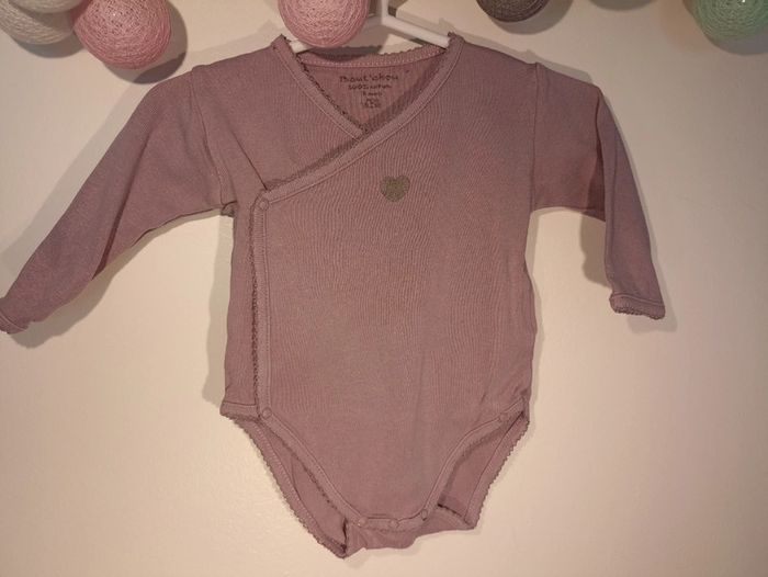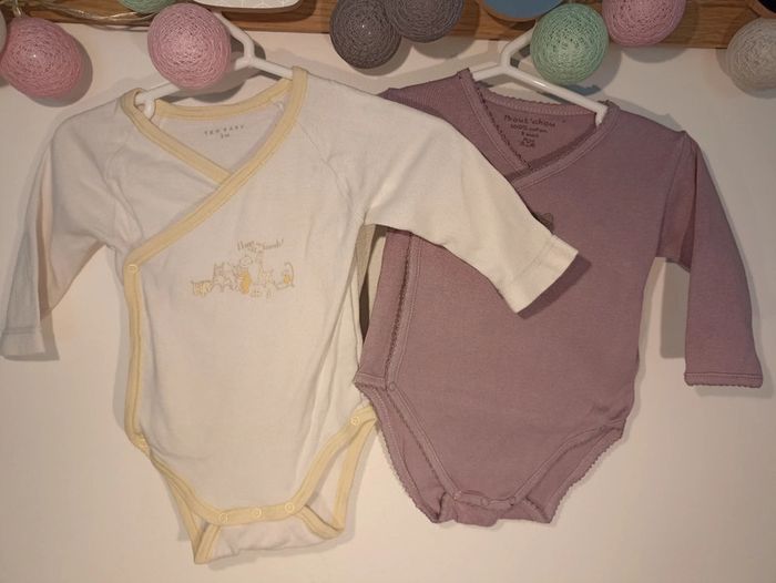 Lot de 2 bodies fermeture par pressions à l'avant 1 blanc avec liseré jaune et impression bébé et jouets 1 violet impression cœur violet à paillettes N'hésitez pas à parcourir mon dressing pour d'autres pièces pour bébé et pensez aux lots