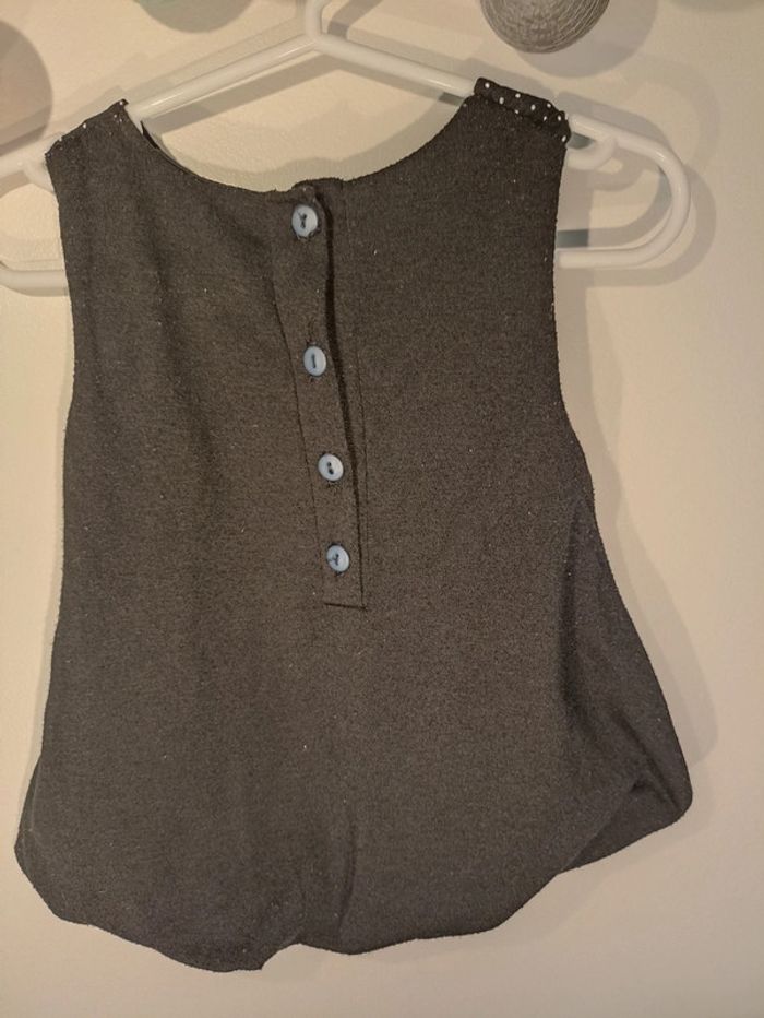 Robe à carreaux noire et grise et col noir à pois blancs et 3 petits boutons argentés. Dos noir uni. N'hésitez pas à parcourir mon dressing pour d'autres pièces pour bébé et pensez aux lots
