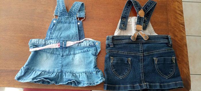 2 salopettes robes en 6 mois. La bleu claire vient de chez Kimadi et la bleu foncé de pikouic. Les lanières dans le dos sont abîmées sur la bleu foncé (voir photo)