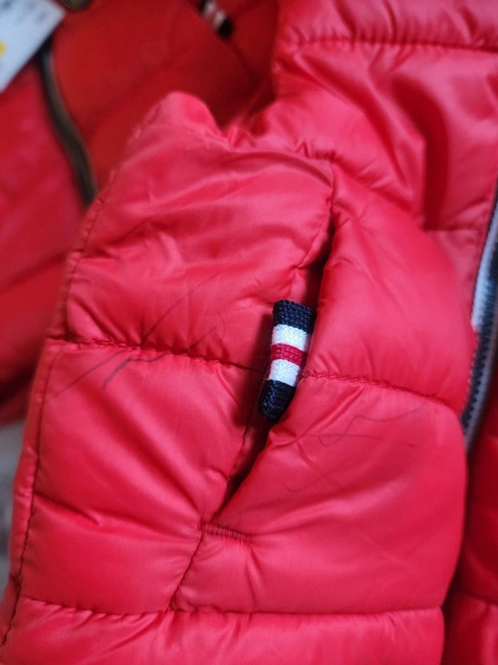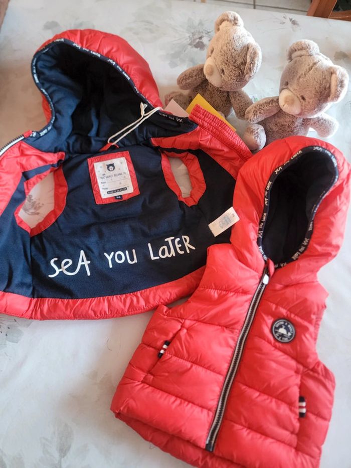 Doudoune sans manches rouges neuves avec étiquettes. Il y en a une qui a des traces de crayons, voir photo. Je l'ai reçu comme ça. Mes garçons n'ont pas pu en profités. Jumeaux 1mois. Taille grand