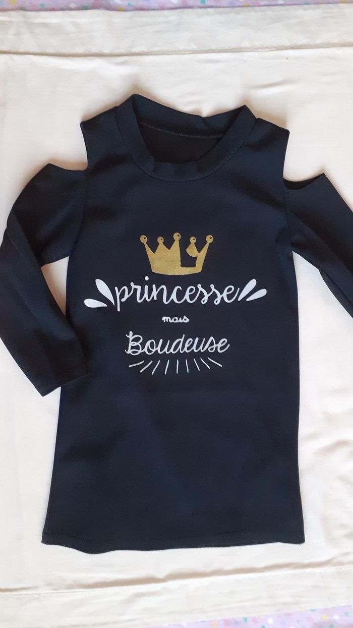 Vends une robe en polyester manches longues avec épaules dénudées noire avec écritures blanches et motif doré taille 4 ans.