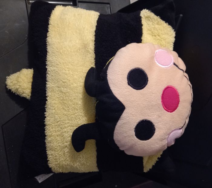 Coussin, doudou pouvant servir d'oreiller chez nounou, à l'école, à la garderie ou même chez papy et mamie En forme d'abeille Idéal pour ranger son doudou à l'intérieur ou pour ranger son pyjama Couleur noir et jaune