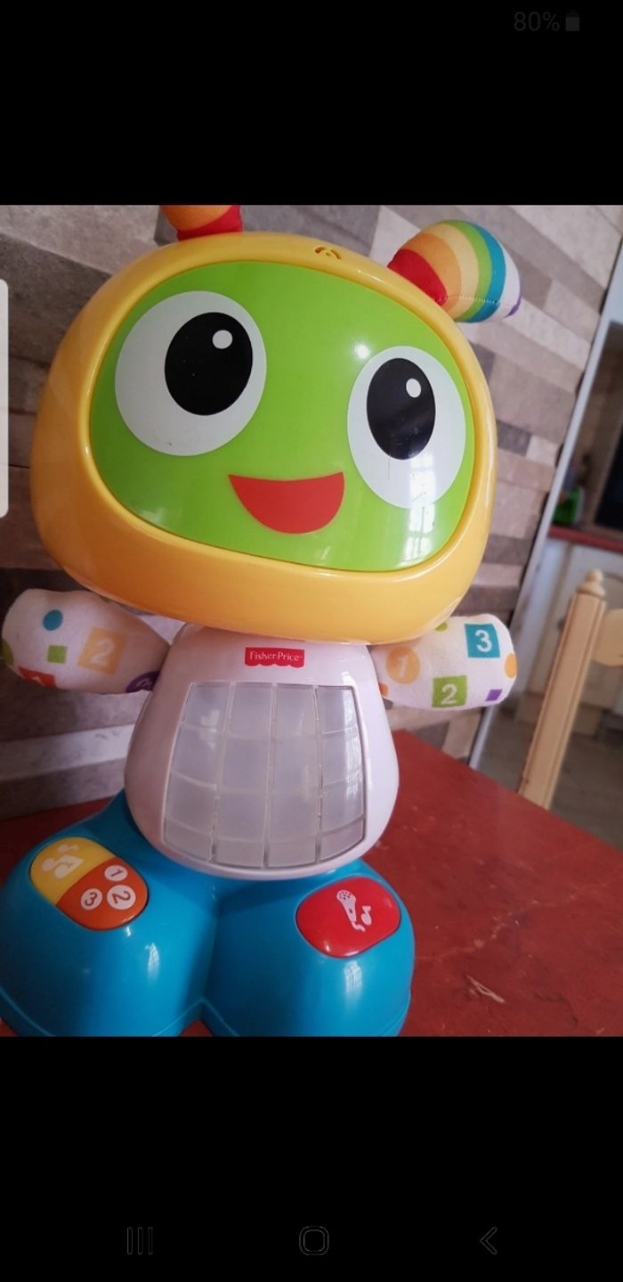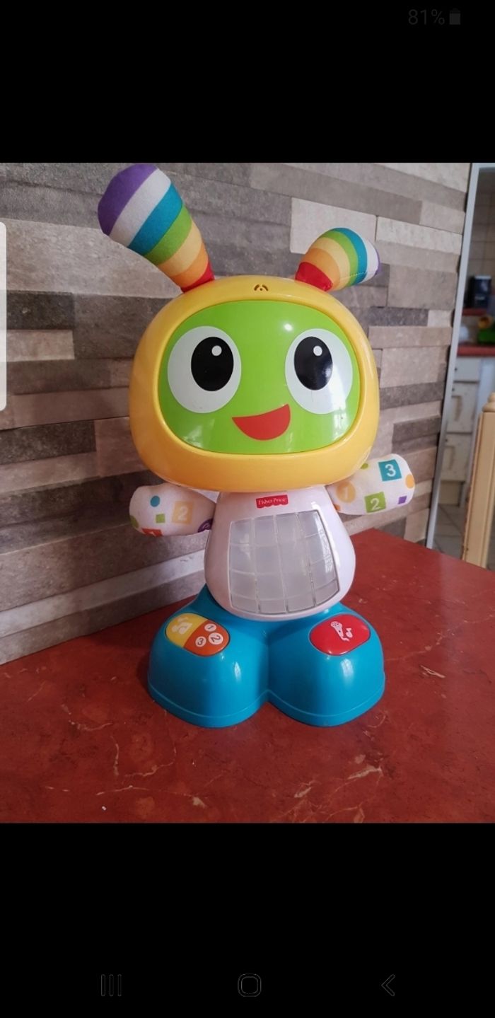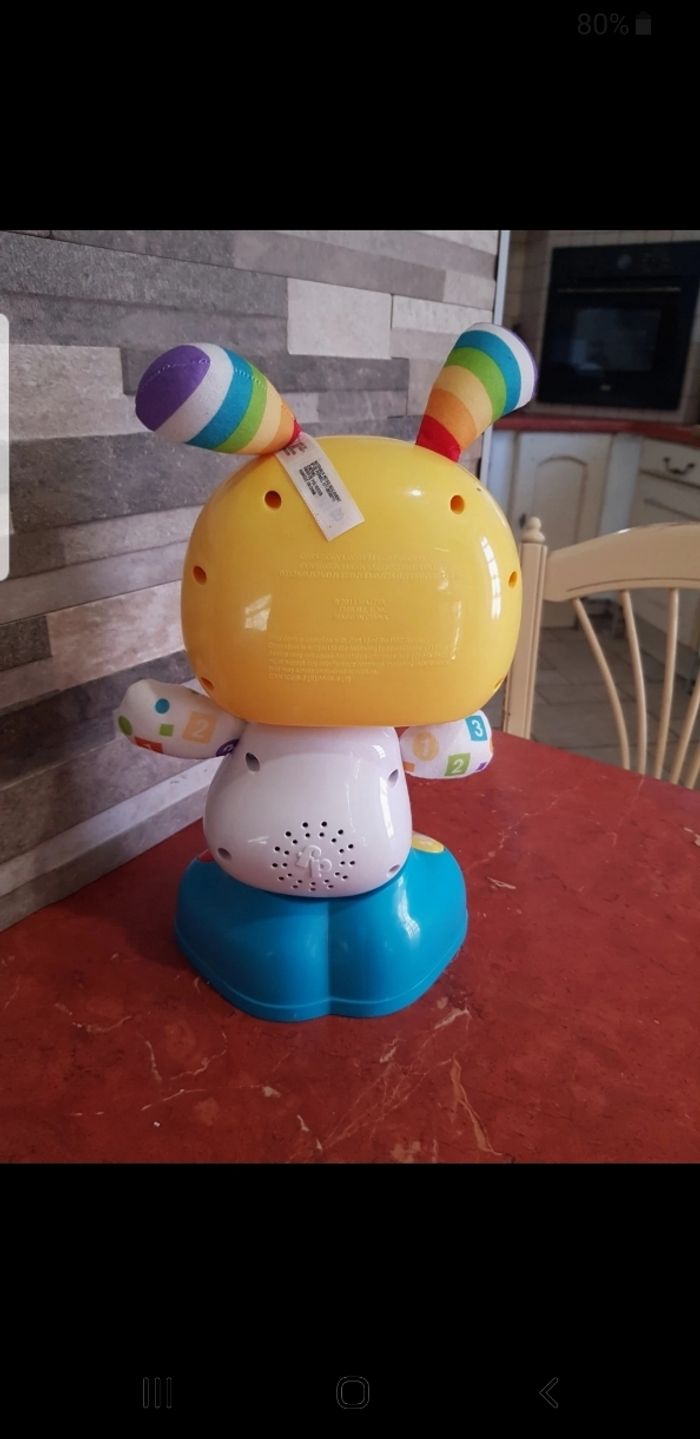 Adapté pour un enfant de 9 à 36 mois. Robot ludique et amusant qui offre de multiples possibilités d apprentissage: les calculs, les lettres et les couleurs . Chante, danse. Mesure environ 30 cm