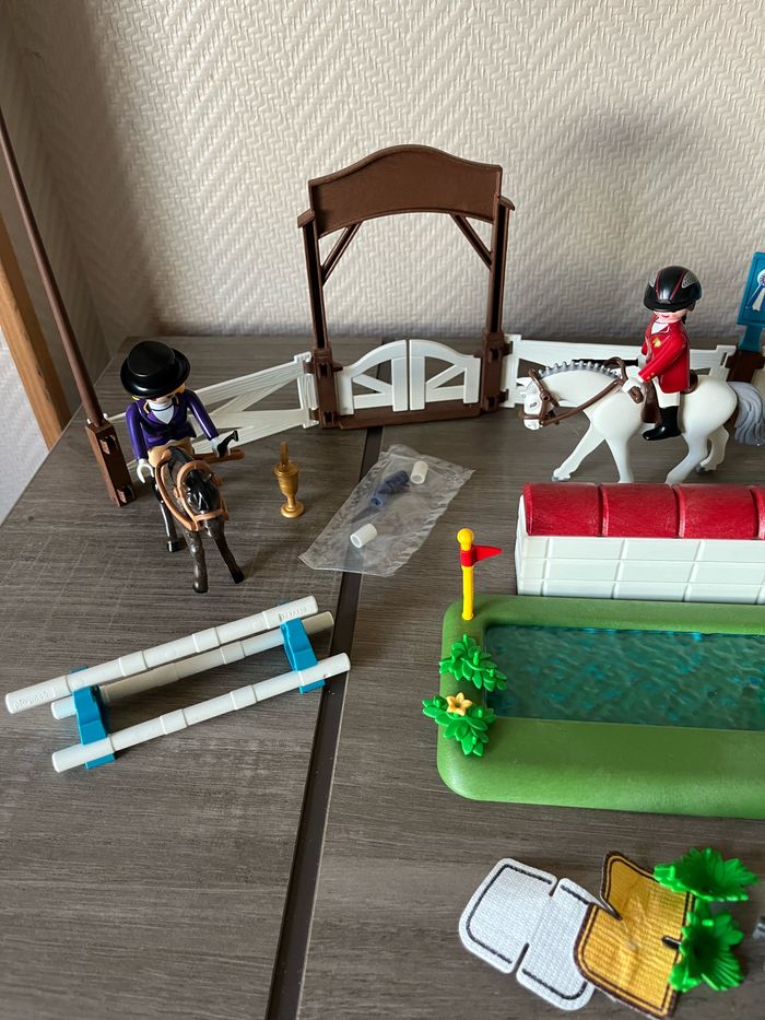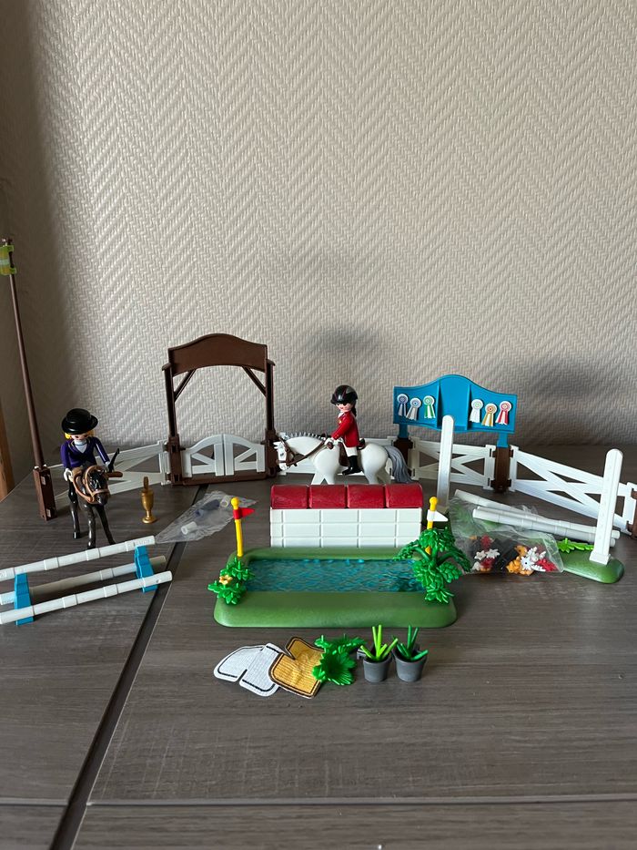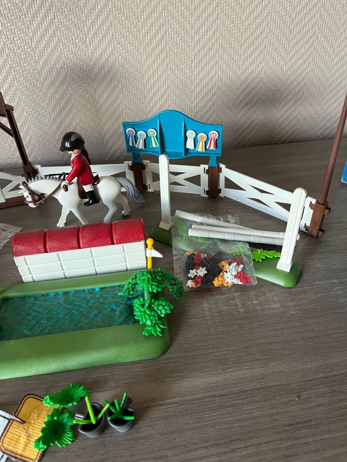 Playmobil en très bon état et complet. Un paquet d’accessoires est encore neuf. La boîte est disponible. Il manque simplement les stickers rouges sur les barres d’obstacles.