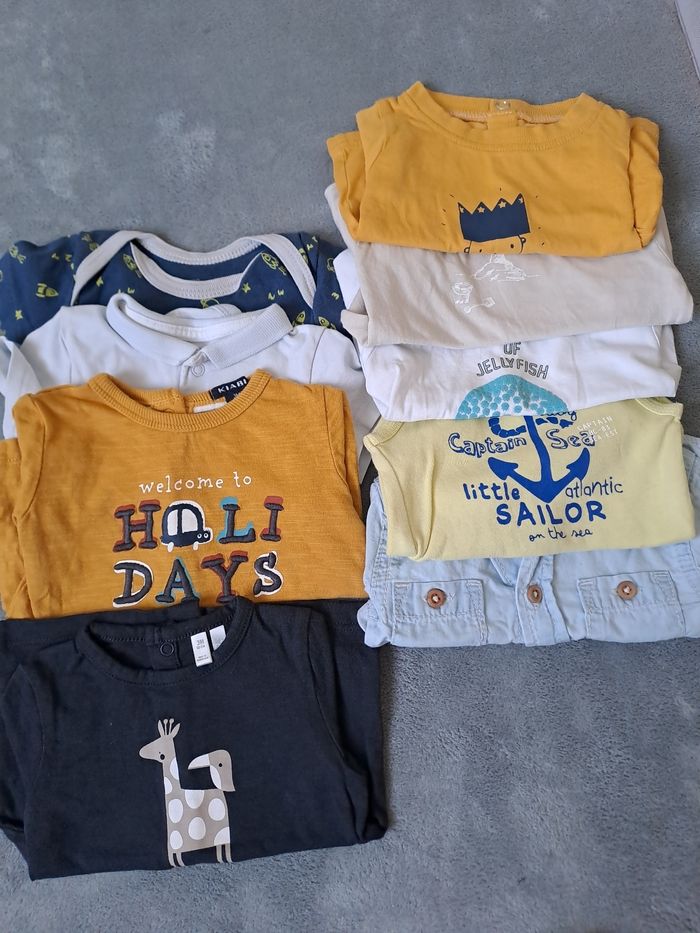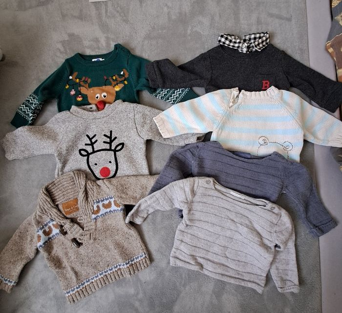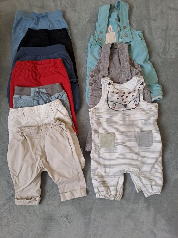 Le lot comprend: - 6 pantalons - 3 salopettes - 7 pulls - 9 tee shirt Tout est en très bon état. Pas de trous, pas de tâches, et maison sans animaux ni fumeur.