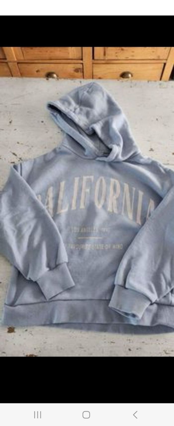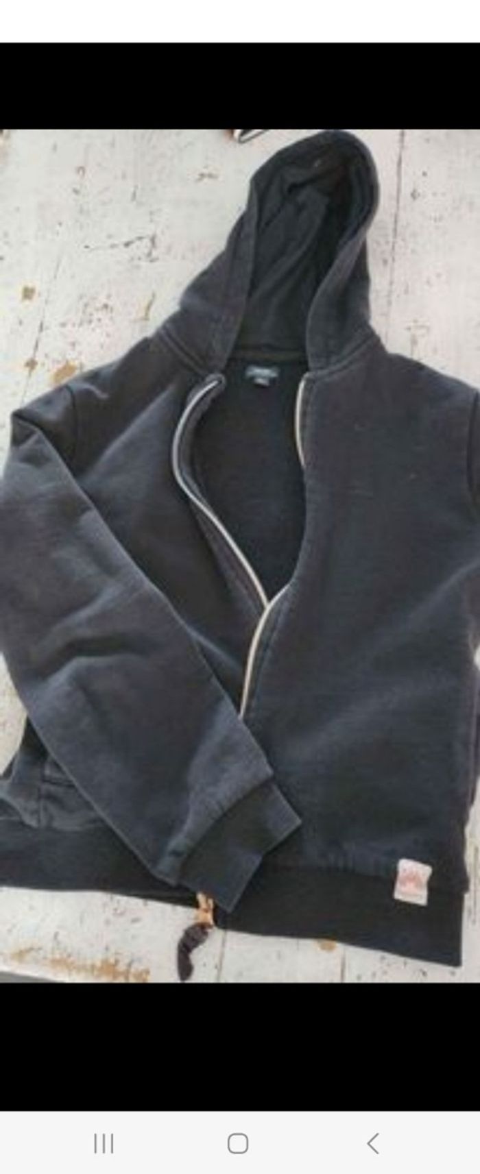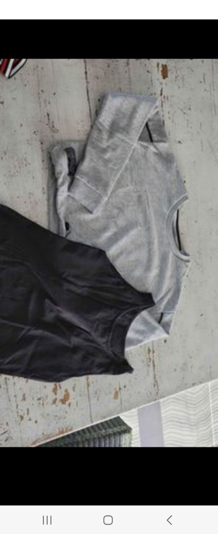 3 hauts manches longues avec col montant, 1 sweat bleu avec capuche, 1 gilet noir avec capuche, 1 sweat avec t-shirt noir et 2 leggins sport