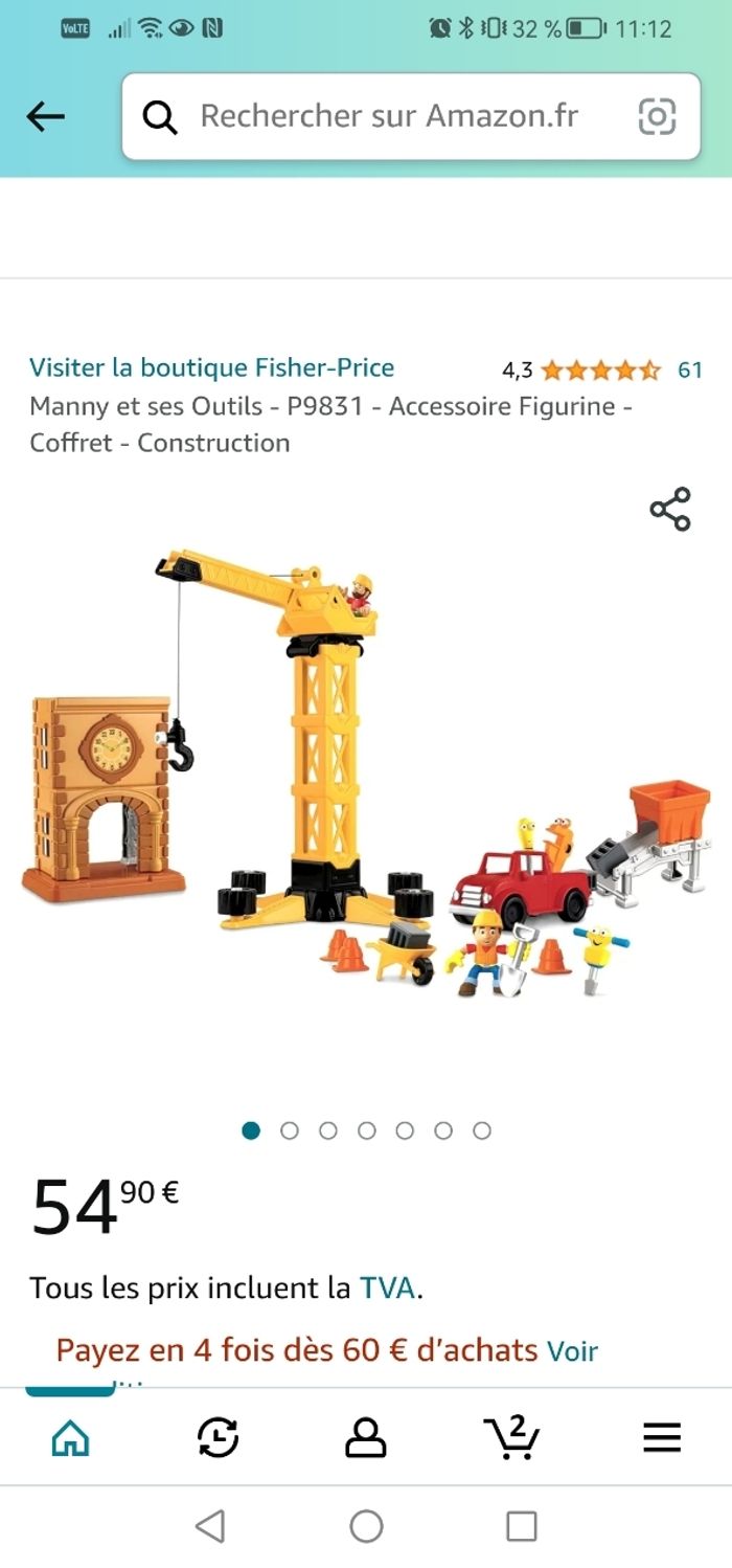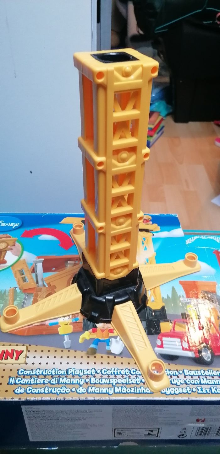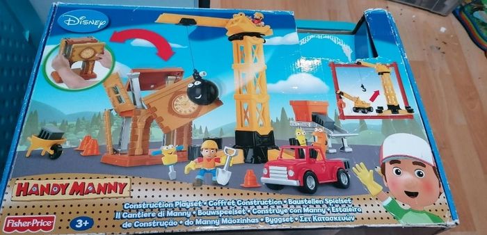 Jeu de construction manny et ses outils Comprend une horloge a construire et une grue pour détruire la construction Vendue avec sa boîte d'origine abîmée. Le jeu est complet, j'en avait acheté un 2eme pour compléter celui de mon fils. Il y a donc des pieces en double (pratique en cas de perte) Vendu 54.90 sur amazon