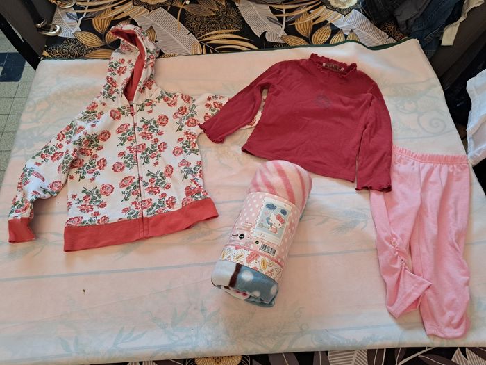 -1 plaid/ couverture neuve hello kitty - 1 gilet - 1 legging/caleçon - 1 tee-shirt manches longues 24 mois En très bon état Couverture neuve ( 120x140) Marque : creeks, Lisa rose, hello kitty