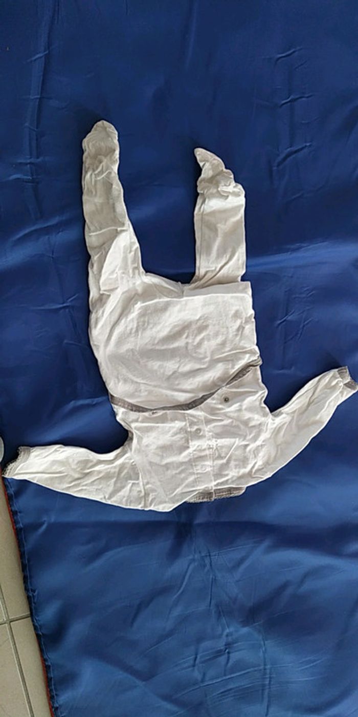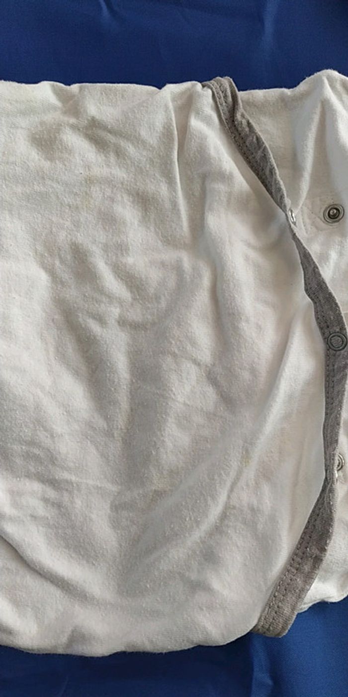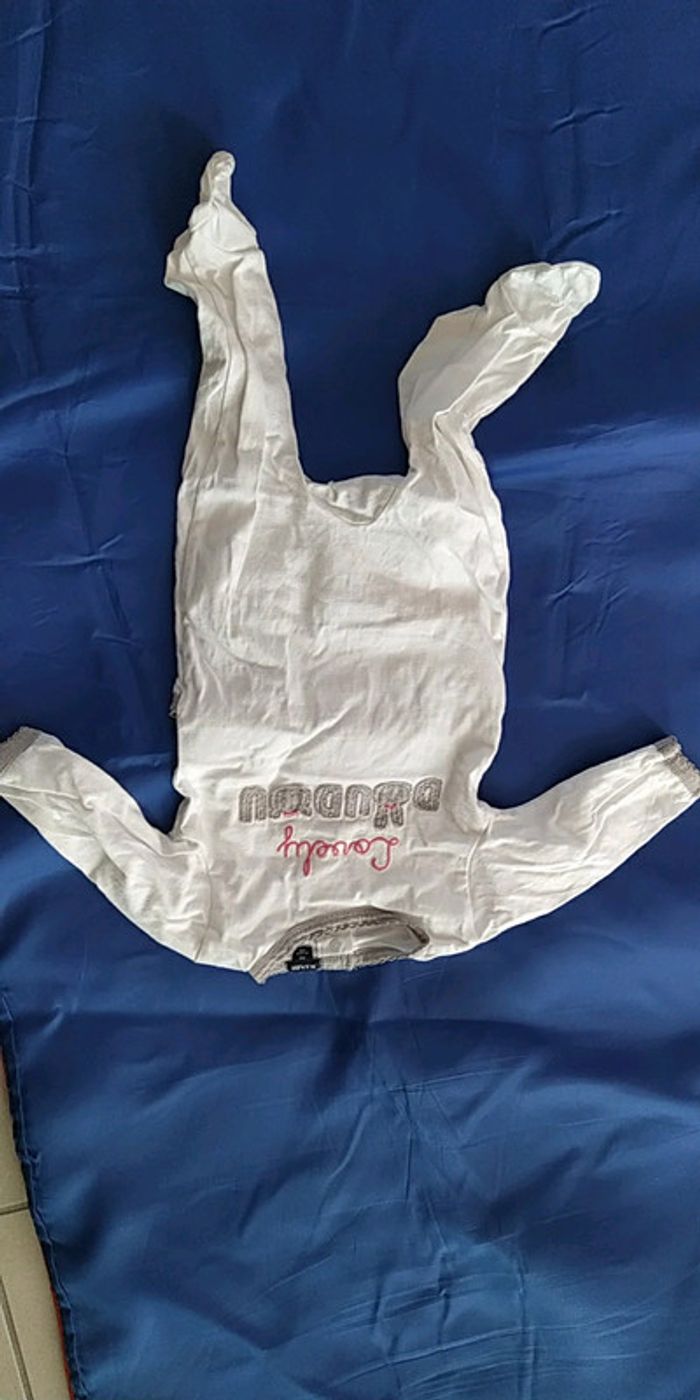 Pyjama léger blanc Encolure et poignets gris Inscription " lovely doudou" Petites tâches jaunâtres au bas du dos