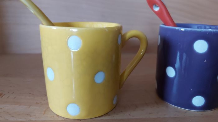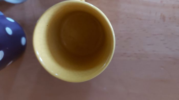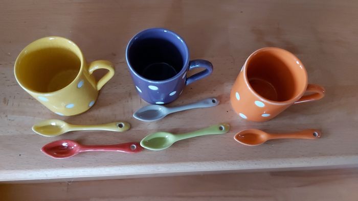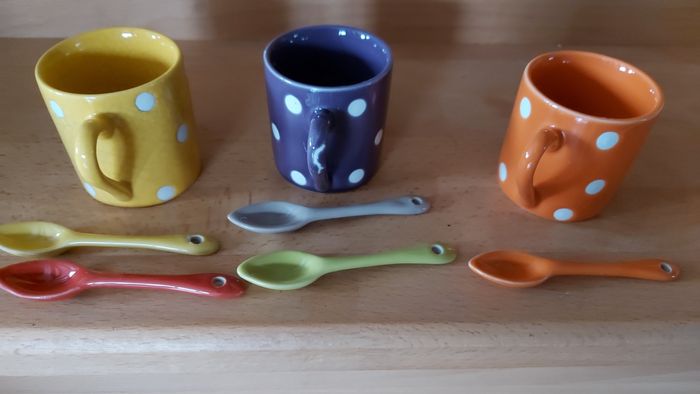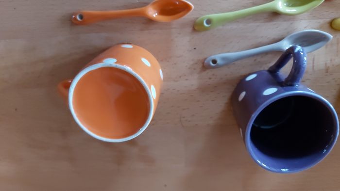 3 petite tasses ht 6 x diamètre 5 cm 5 petites cuillères L 9 cm La tasses jaune est fort endommagée