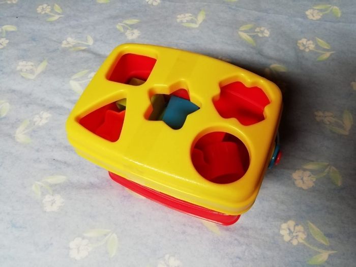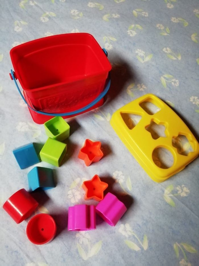 Petite boîte en plastique rouge avec anse. 10 formes géométriques