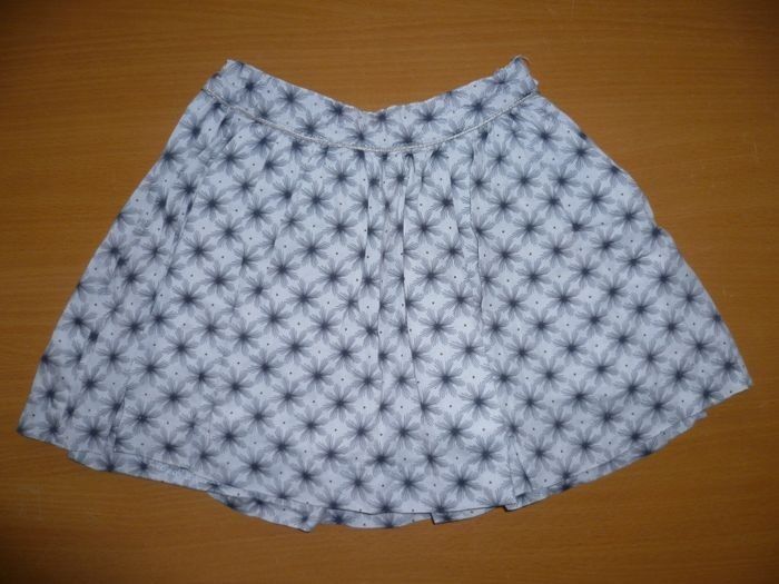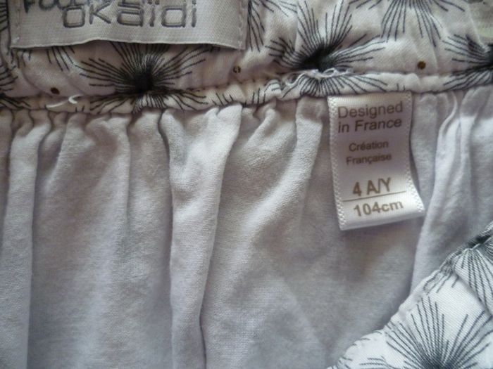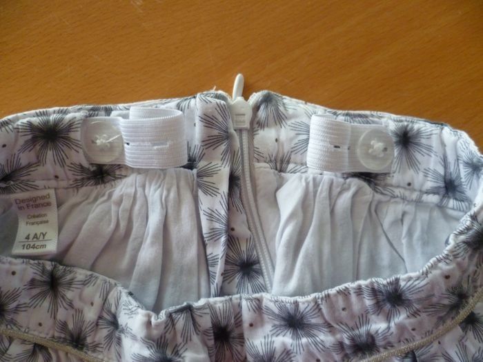 Jupe courte en bon état, taille 4 ans, avec motifs rayonnants gris et points dorés sur fond blanc. Biais contrastant brillant au niveau de la taille. Jupe doublée. Taille ajustable par boutons à l'intérieur et fermeture par fermeture éclair (voir photo 5). Marque : Okaïdi. L'ourlet de la jupe a été recousu au fil blanc (voir photo 6). Pas d'autre défaut particulier repéré. Nom noté sur l'étiquette. Les vêtements d’enfants que je vends ont été portés, ils sont vendus bien évidemment lavés, mais non repassés. Merci de votre compréhension. Des remises sont possibles en cas d’achat de plusieurs articles. Maison non fumeur et sans animaux. N'hésitez pas à me contacter pour des informations supplémentaires.