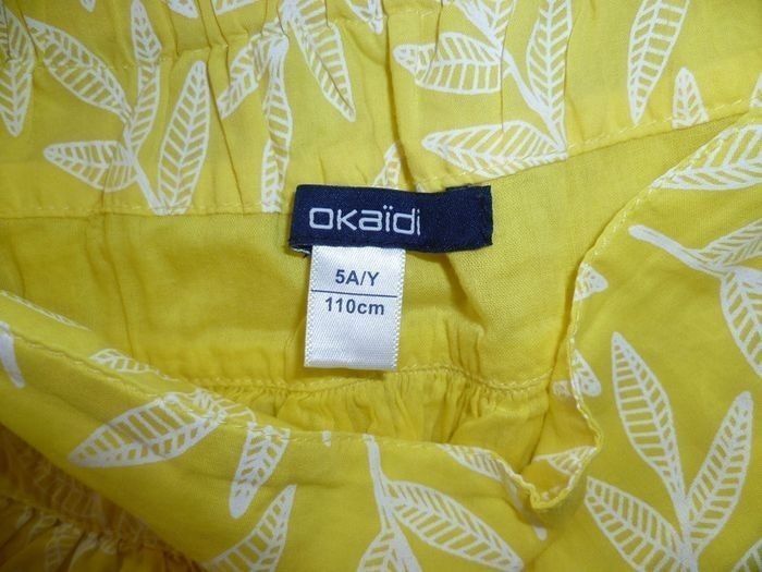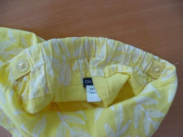 Jupe courte en très bon état, taille 5 ans, à motif feuilles en filigranes blancs sur un fond jaune. Jupe doublée (photo 5). Taille ajustable par boutons à l'intérieur, élastiquée sur l'arrière (voir photo 6). Marque : Okaïdi. Pas de défaut particulier repéré. Peut s'associer à d'autres articles de mon dressing : - legging 3/4 jaune (photo 7) : https://beebs.app/fr/p/9261741-legging-3/4-jaune. Prix groupé : 5,50 € (au lieu de 6,50 €) - débardeur motif fruits où les ananas sont jaune (photo 8) : https://beebs.app/fr/p/9261732-débardeur-rose-fruits. Prix groupé : 4,70 € (au lieu de 5,50 €) Les vêtements d’enfants que je vends ont été portés, ils sont vendus bien évidemment lavés, mais non repassés. Merci de votre compréhension. Des remises sont possibles en cas d’achat de plusieurs articles. Maison non fumeur et sans animaux. N'hésitez pas à me contacter pour des informations supplémentaires.