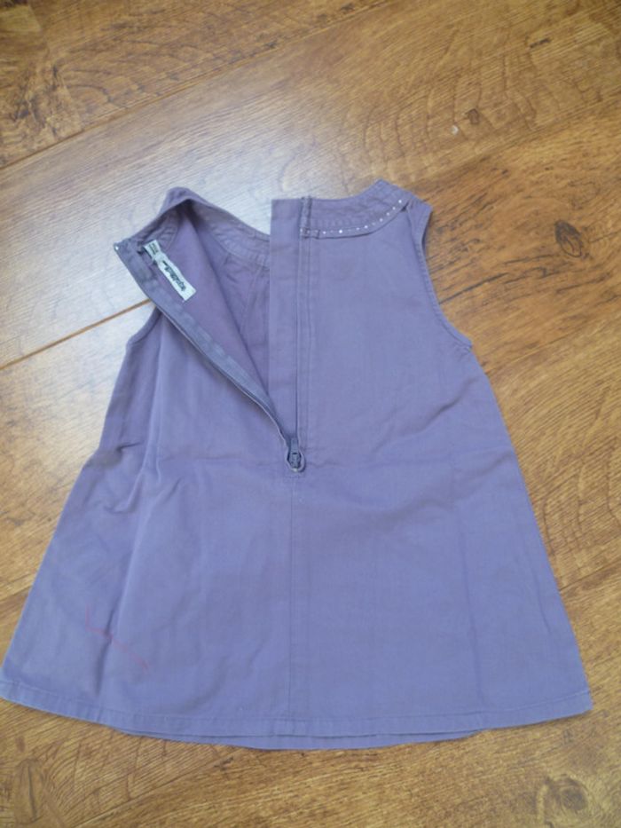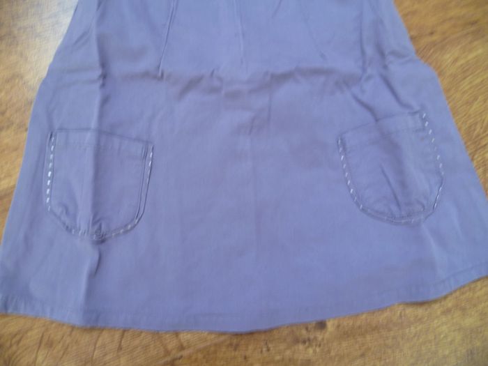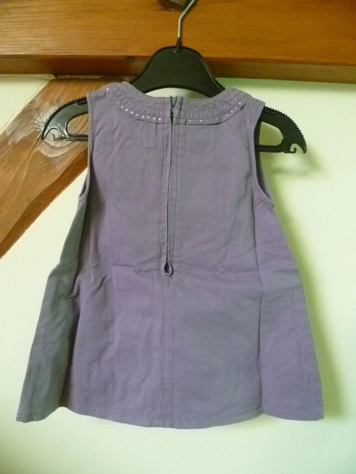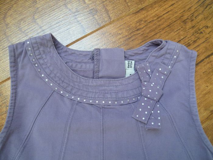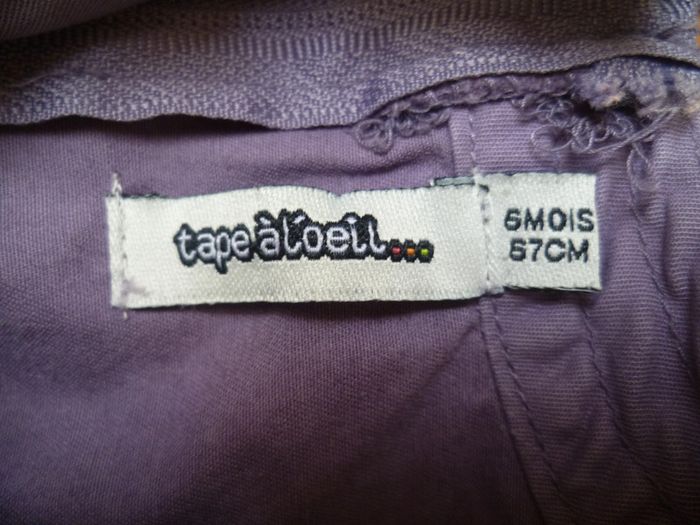 Taille 6 mois Tissu 100% coton Fermeture éclair dans le dos qui descend à mi-hauteur, 2 poches Couleur violine et points argentés au col, au contour des poches et sur le petit noeud décoratif