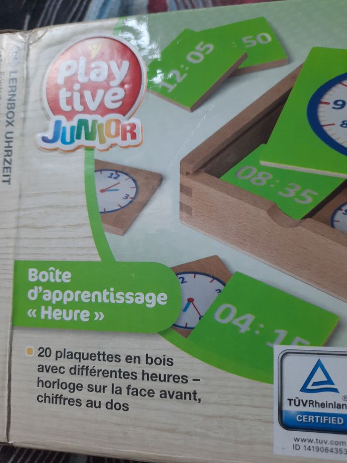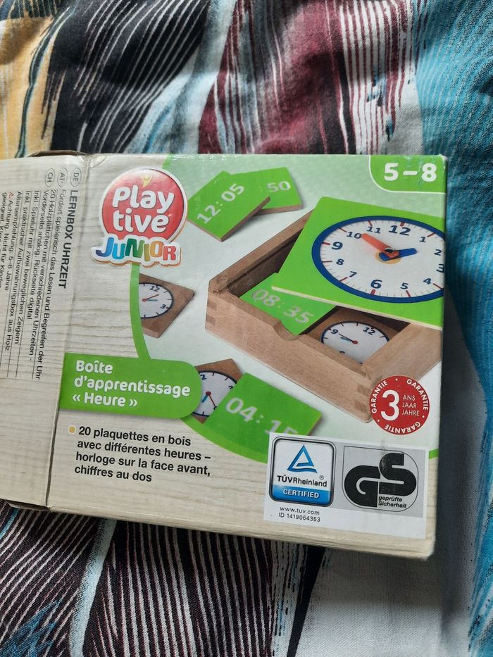 Jeu pour apprendre l'heure. En bois. Jamais utilisé juste la boite à été ouverte. Complet.