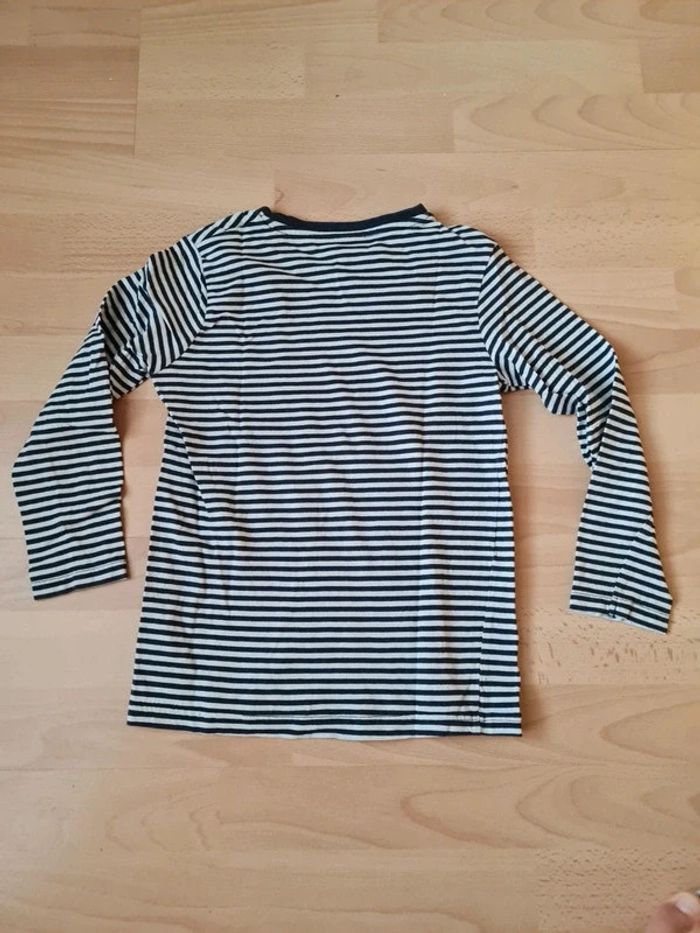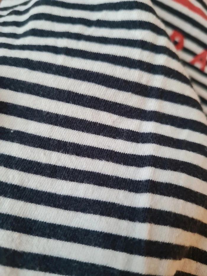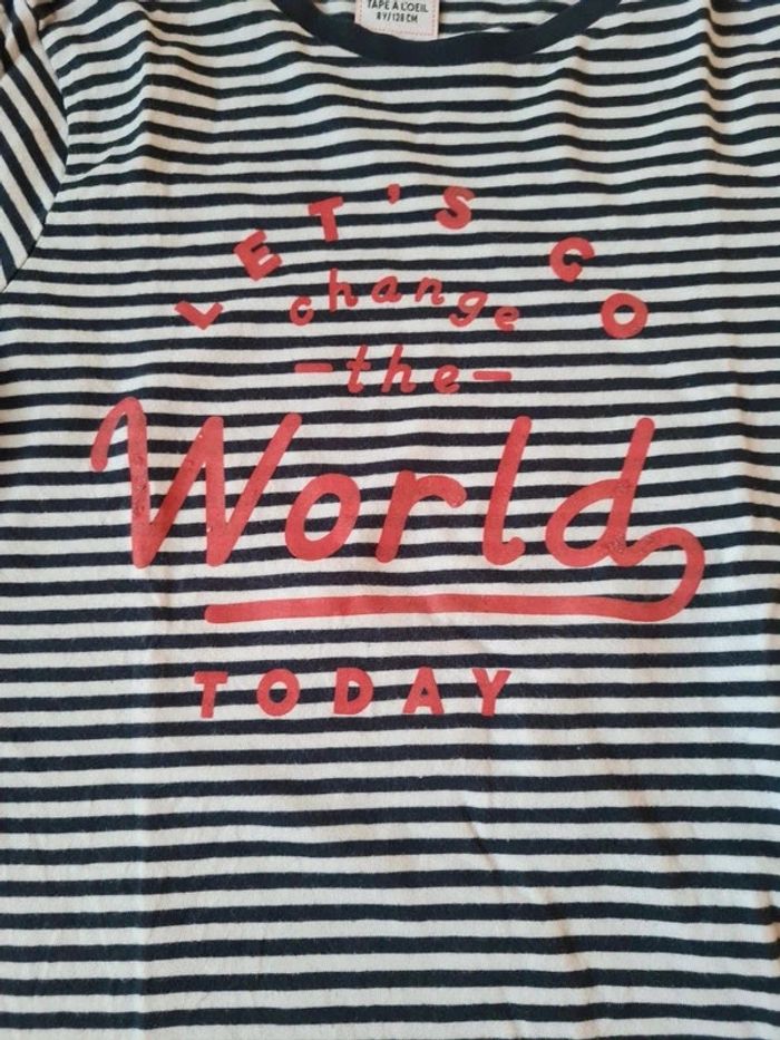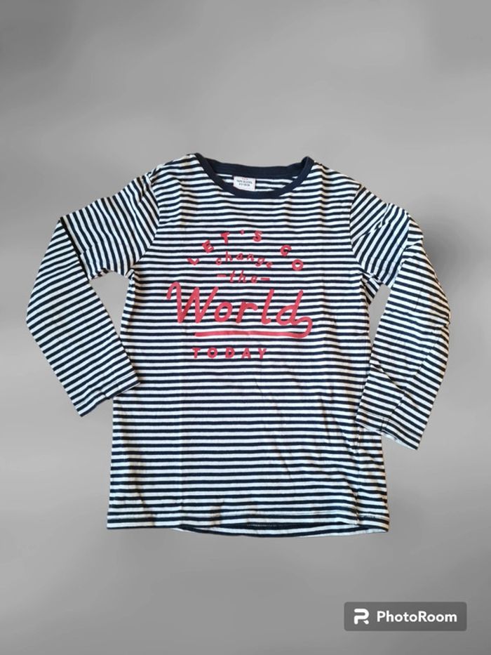 T-shirt manches longues Tape à l'Oeil 8 ans. Rayé bleu marine et blanc, inscription rouge, col rond. En coton. Très bon état (très fines "bouloches"->photo) Articles lavés avant la vente, maison non fumeur