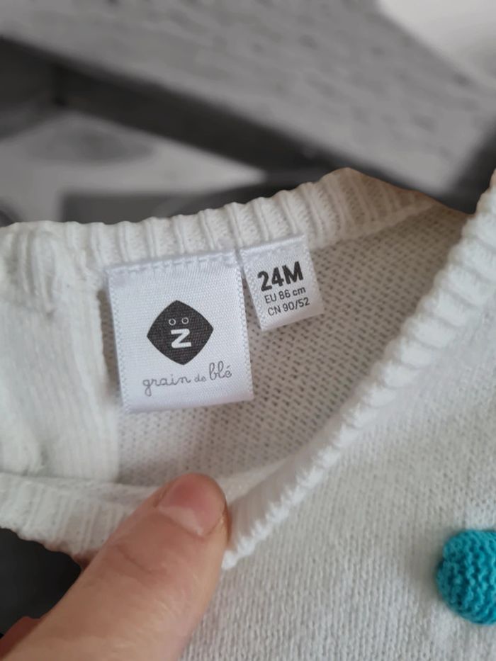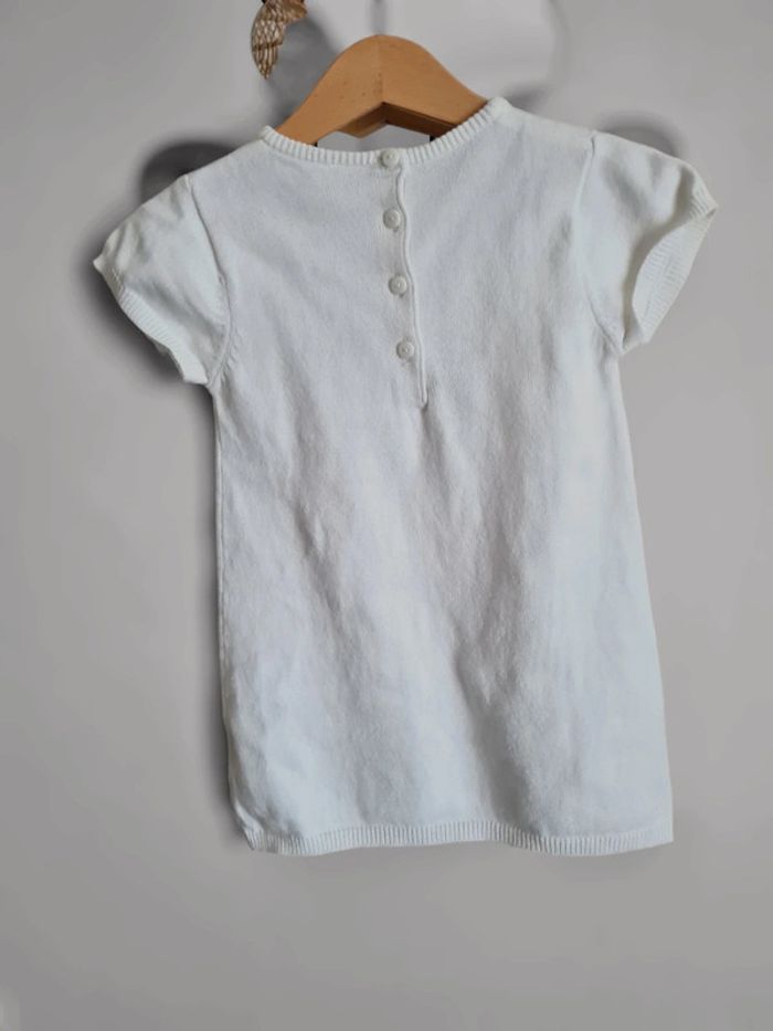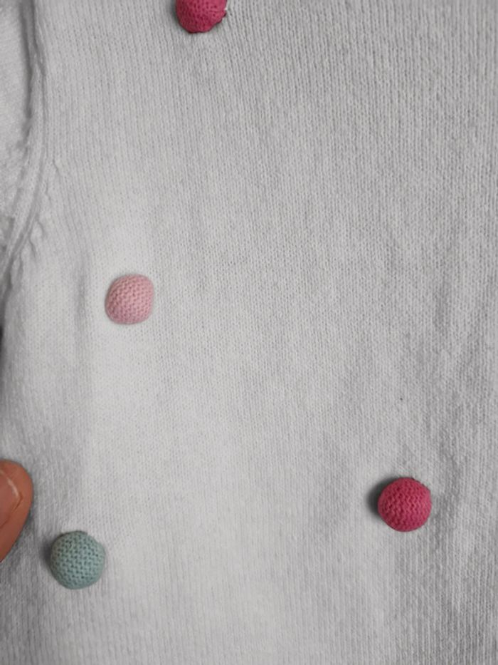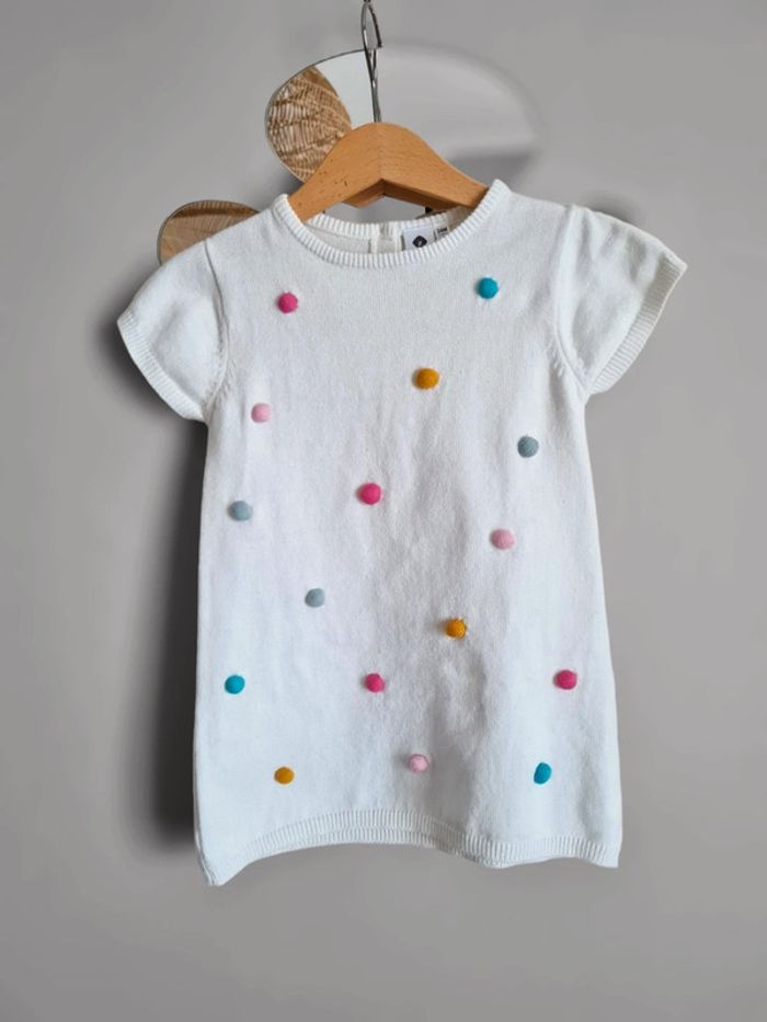 Robe manches courtes en maille Grain de Blé 24 mois. Blanche avec petit pompons milticolores pastels. Coupe droite, boutons dans dos. Très mignonne, idéale mi-saison. Ma fille n'a jamais eu l'occasion de la portée. Neuve, deulement lavée. Maison non fumeur.