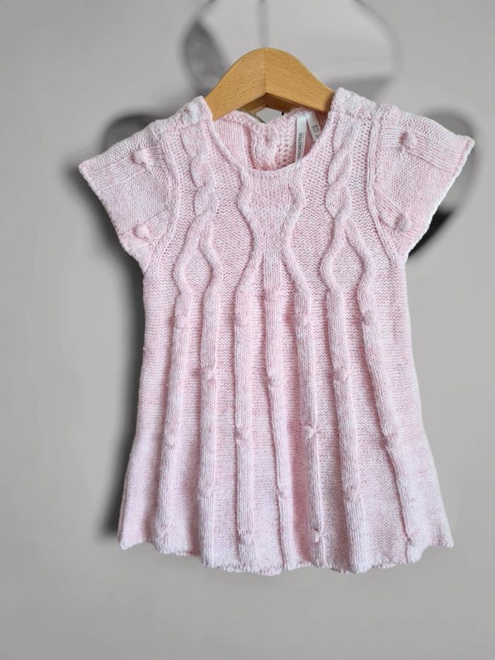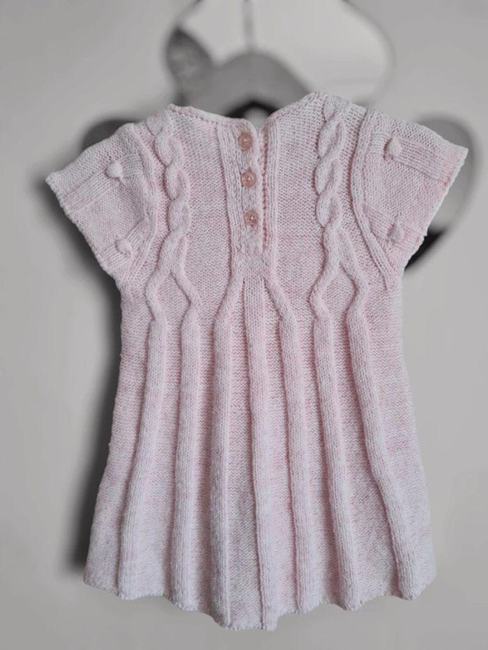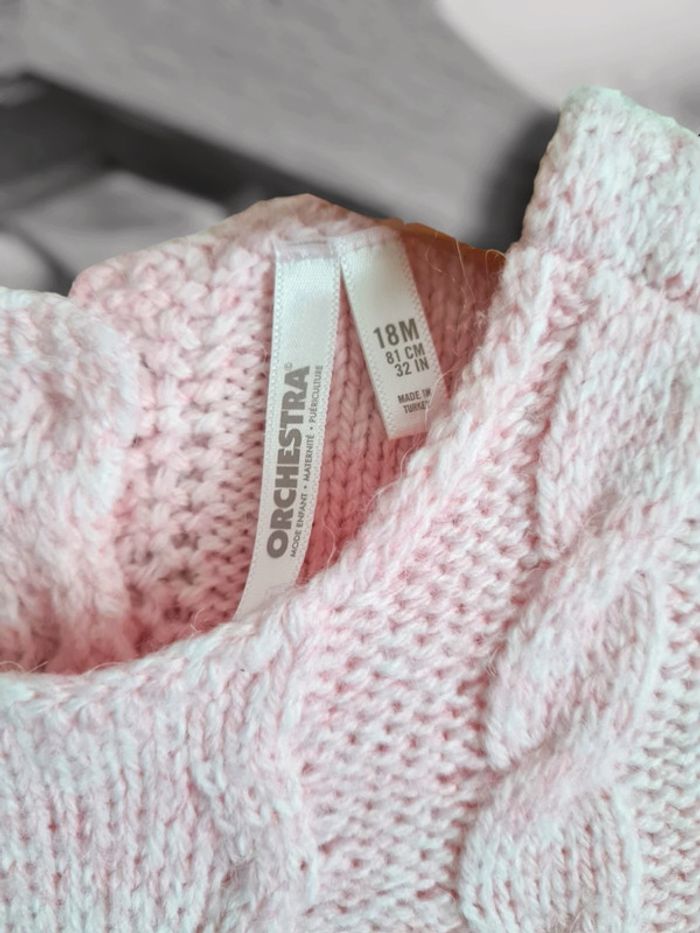 Très jolie robe en maille taille 18 mois Orchestra. Rose pâle. Manches courtes, forme légèrement évasée, différents côtes tricotées et petits pompons. Boutons dans le dos. Très jolie robe mi-saison mais ma fille n'a jamais eu l'occasion de la portée. Neuve, juste lavée