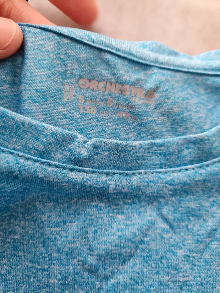 T-shirt manches longues Orchestra 5 ans. Long avec base arrondi, matière "technique "(comme pour les vêtements de sport). Bleu clair moucheté avec imprimé bleu marine. Comme neuf, porté 1 ou 2 fois. Tous mes articles sont lavés avant la vente. J'ai beaucoup d'articles donc n'hésitez pas à utiliser les filtres sur mon dressing pour trouver votre bonheur, faire des lots et profiter de réductions ! 😊