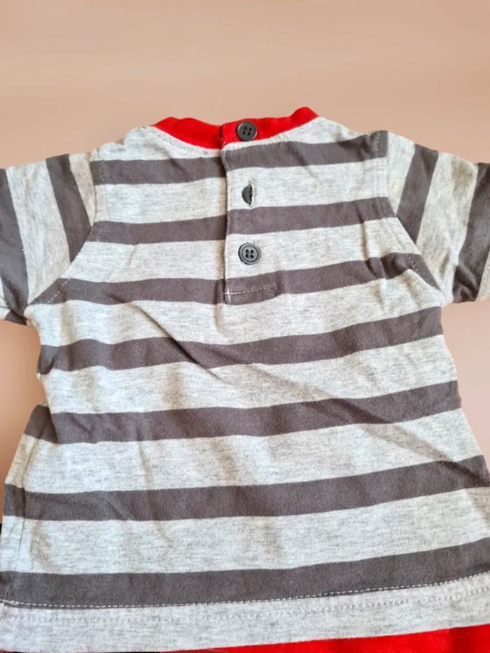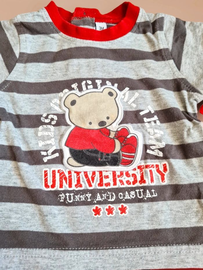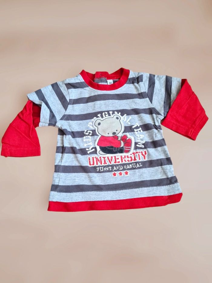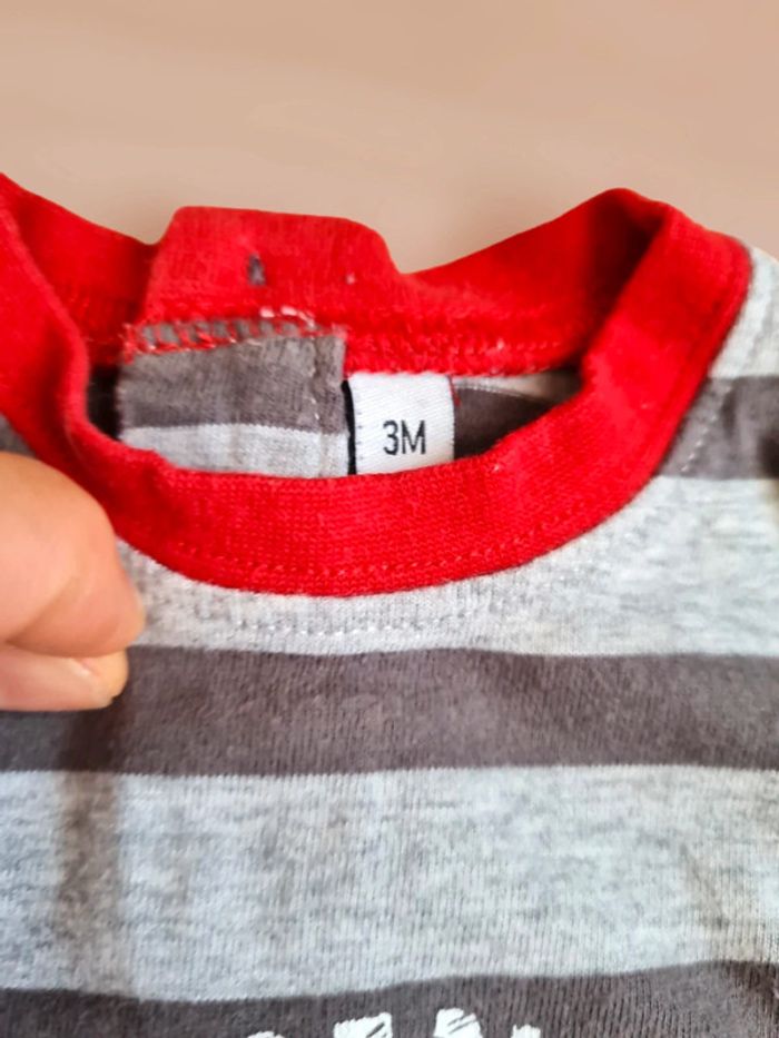 Haut impression t-shirt manches courtes rayé gris clair et foncé, avec imprimé ourson rouge et inscription. Col, base et manches longues rouges. Boutons dans le dos. Taille 3 mois Tex. Excellent état. Tous mes articles sont lavés avant la vente. J'ai beaucoup d'articles donc n'hésitez pas à utiliser les filtres sur mon dressing pour trouver votre bonheur, faire des lots et profiter de réductions ! 😊