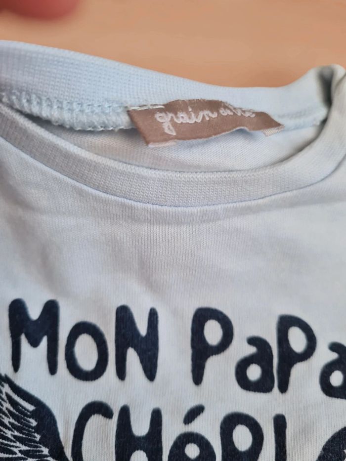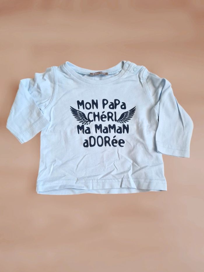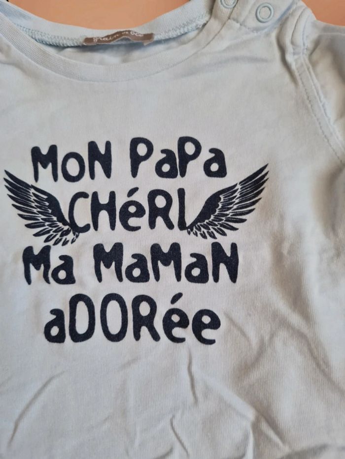 T-shirt manches longues bleu clair avec inscription Bleu marine "mon papa chéri ma maman adorée ". 2 pressions sur épaule. Marque Grain de Blé, taille 3 mois. Comme neuf. Tous mes articles sont lavés avant la vente. J'ai beaucoup d'articles donc n'hésitez pas à utiliser les filtres sur mon dressing pour trouver votre bonheur, faire des lots et profiter de réductions ! 😊