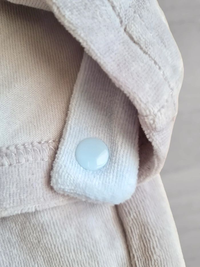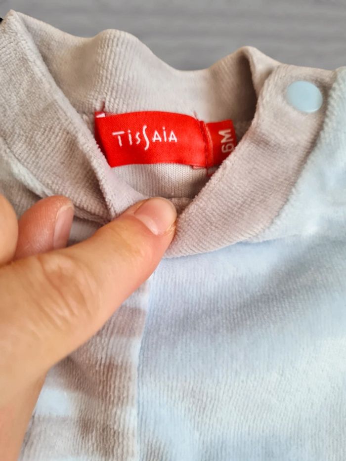 Pyjama 2 pièces en velours Tex 6 mois Tissaia Gris et turquoise, pantalon avec pieds, attaches à pression pour lier le haut du pantalon. Neuf, jamais porté, juste lavé.