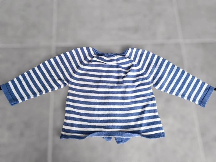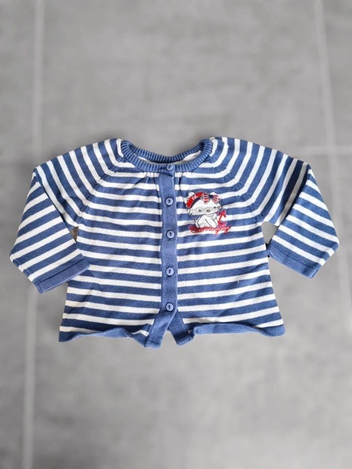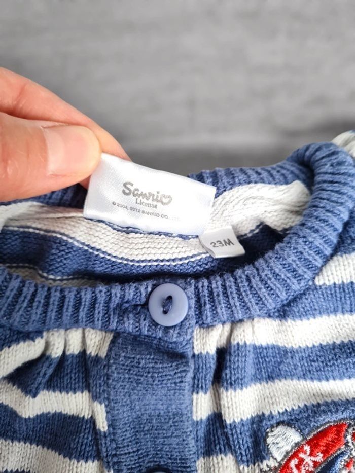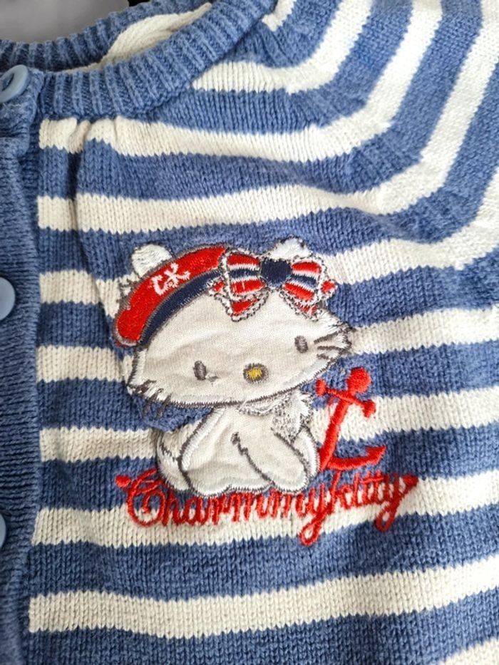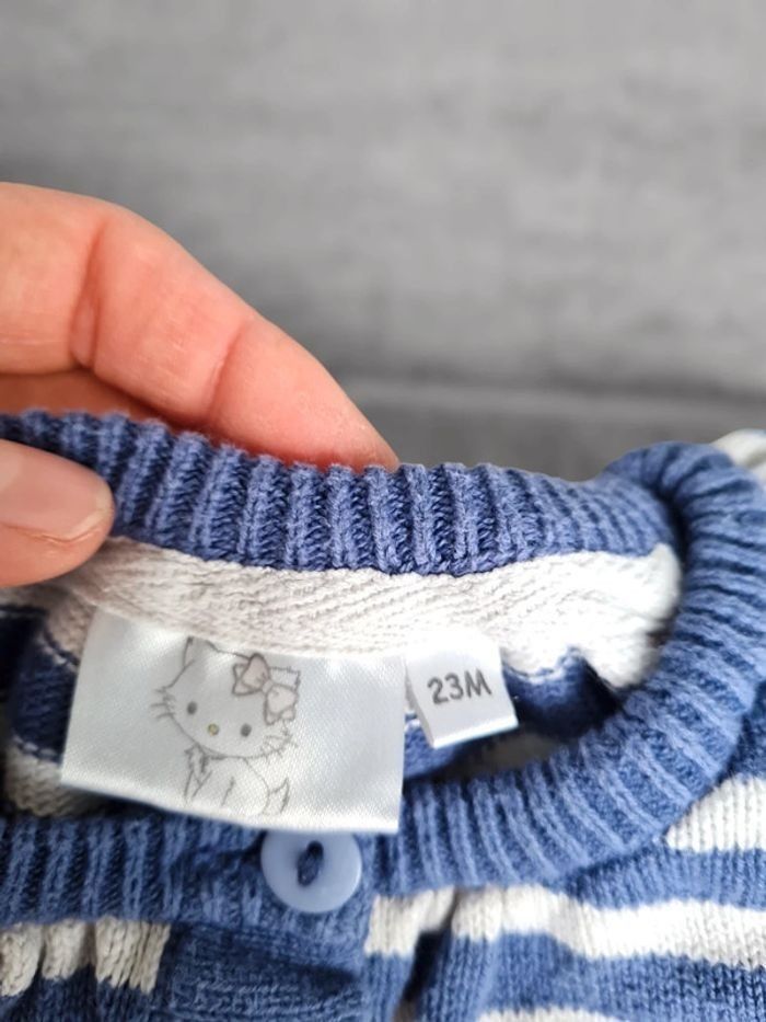 Gilet en maille 23 mois Hello Kitty. Rayé bleu et blanc avec broderie. A boutons. Très bon état. Lavé avant vente, maison non fumeur