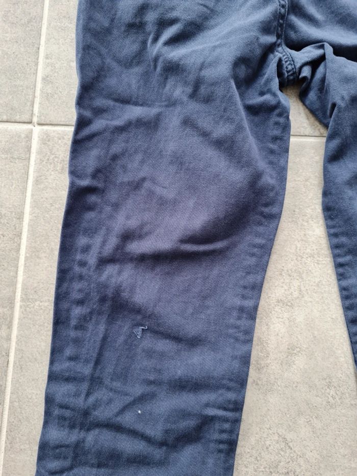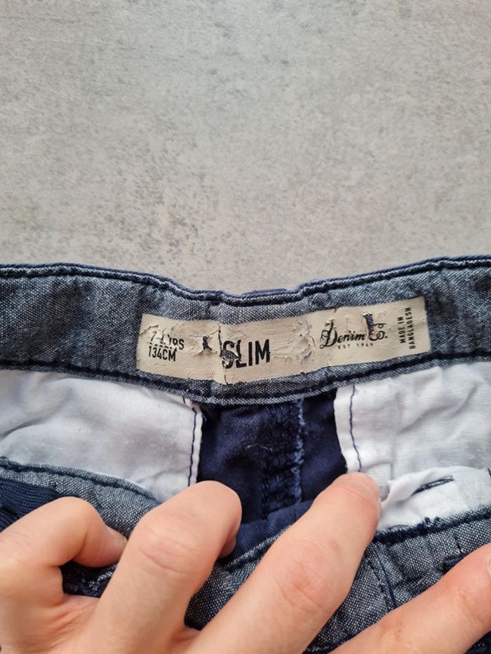 Jeans bleu marine taille 7-8 ans marque Denim&CO. Coupe slim, possibilité de retourner le bas (motif sur revers). Léger accroc niveau genou droit (cf 2 dernières photos, assez discret) sinon très bon état. Tous mes articles sont lavés avant la vente. Maison non fumeur. N'hésitez pas à faire des lots pour profiter de réductions 😉