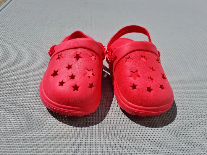 Sandales/sabots légers en plastique type Cr.cs, avec une lanière élastique à l'arrière. Taille 19, excellent état. Tous mes articles sont lavés avant la vente. N'hésitez pas à consulter mon dressing pour faire des lots et profiter de réductions !
