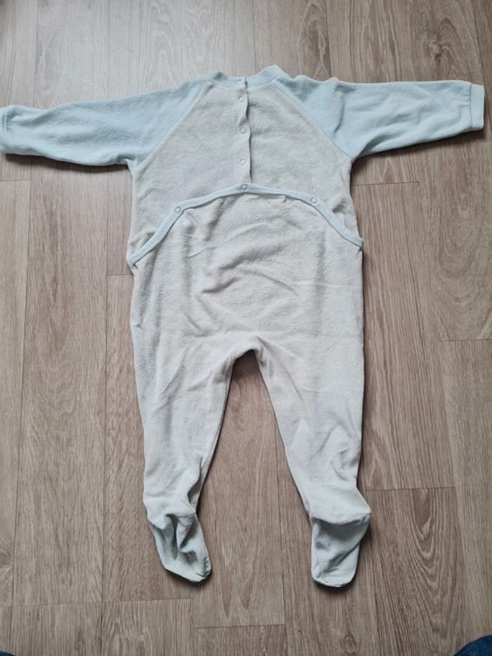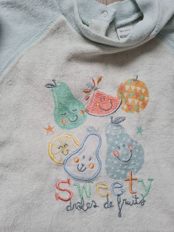 Pyjama grenouillère en velours Absorba taille 18 mois, pressions à l'arrivée. 2 nuances de bleu clair, imprimé/broderies fruits et inscription "fruity drôles de fruits ". Peut être mixte. Très bon état, velours un peu plus rêche sous les pieds. Tous mes articles sont lavés avant la vente. J'ai beaucoup d'articles donc n'hésitez pas à utiliser les filtres sur mon dressing pour trouver votre bonheur, faire des lots et profiter de réductions ! 😊 - 10% dès 3 articles 👗👚🩱 - 20% dès 5 articles 👡👙🧥👖👢