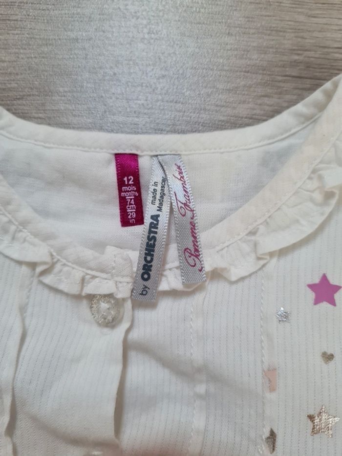 Blouse évasée manche longue marque Orchestra collection Pomme Framboise. Col fantaisie,imprimé etoiles pailletées sur l'avant, petit cœur derrière. Boutons pailletés argentés sur le devant. Doublée. Taille 12 mois. Neuve, jamais portée. Tous mes articles sont lavés avant la vente. J'ai beaucoup d'articles donc n'hésitez pas à utiliser les filtres sur mon dressing pour trouver votre bonheur, faire des lots et profiter de réductions ! 😊 - 10% dès 3 articles 👗👚🩱 - 20% dès 5 articles 👡👙🧥👖👢
