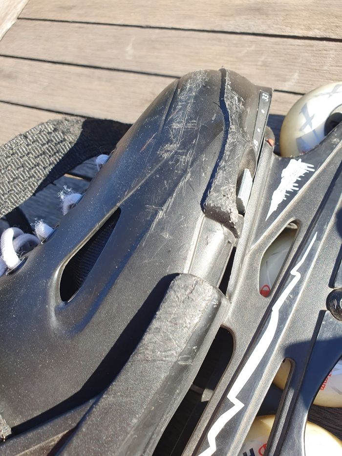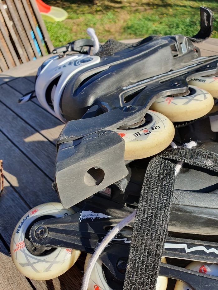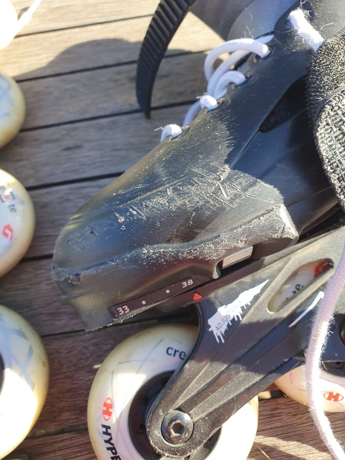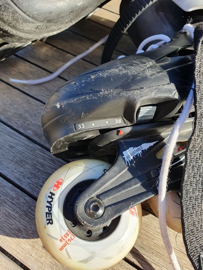 Rollers BLADE FURRY taille ajustable 33 au 38. Beaucoup utilisé en 3 ans (saut, slalom, vitesse) et pas mal de chute d'où les éraflures. Roues pas d'origine, Roues amateurs 76mm/ 85A (dureté gomme) Changement de roue effectué en 2022. Acheté en 2021 : 100€
