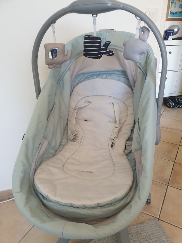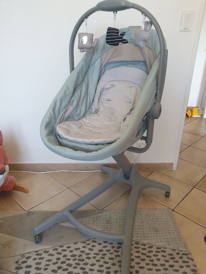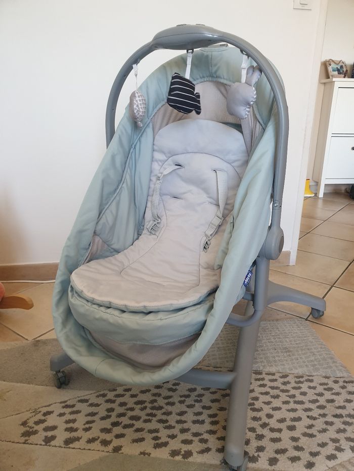 Transat Chicco Baby hug 4 en 1, trés bon état, utilisé seulement quelques mois pour la naissance de notre fils. Positions multiples: berceau (matelas fourni acheté à part), chaise haute avec ceinture de sécurité, première chaise, réglable en hauteur avec poignée, pédale au niveau des pieds et mobile (en état de marche), position transat. Vendu avec sa moustiquaire (acheté à part) Remis en main propre uniquement