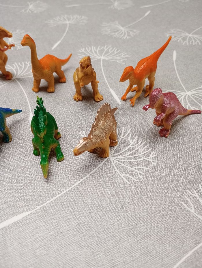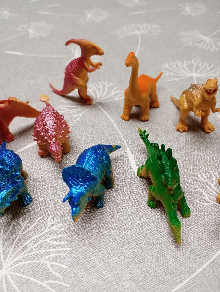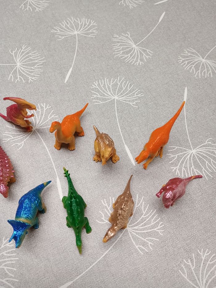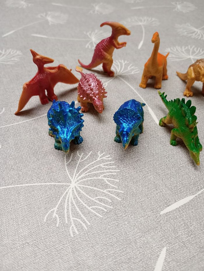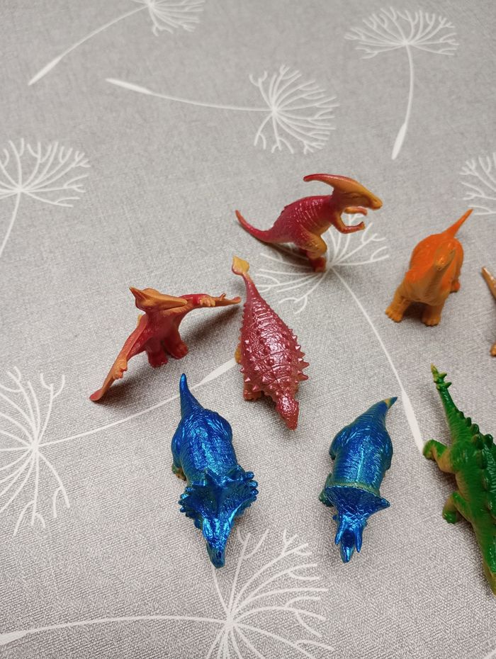 Lot de 11 dinosaures. Certains sont irisés, nacrés, brillants. Dimensions : +- 6 cm de long, 2,5 cm de haut. Très bon état.